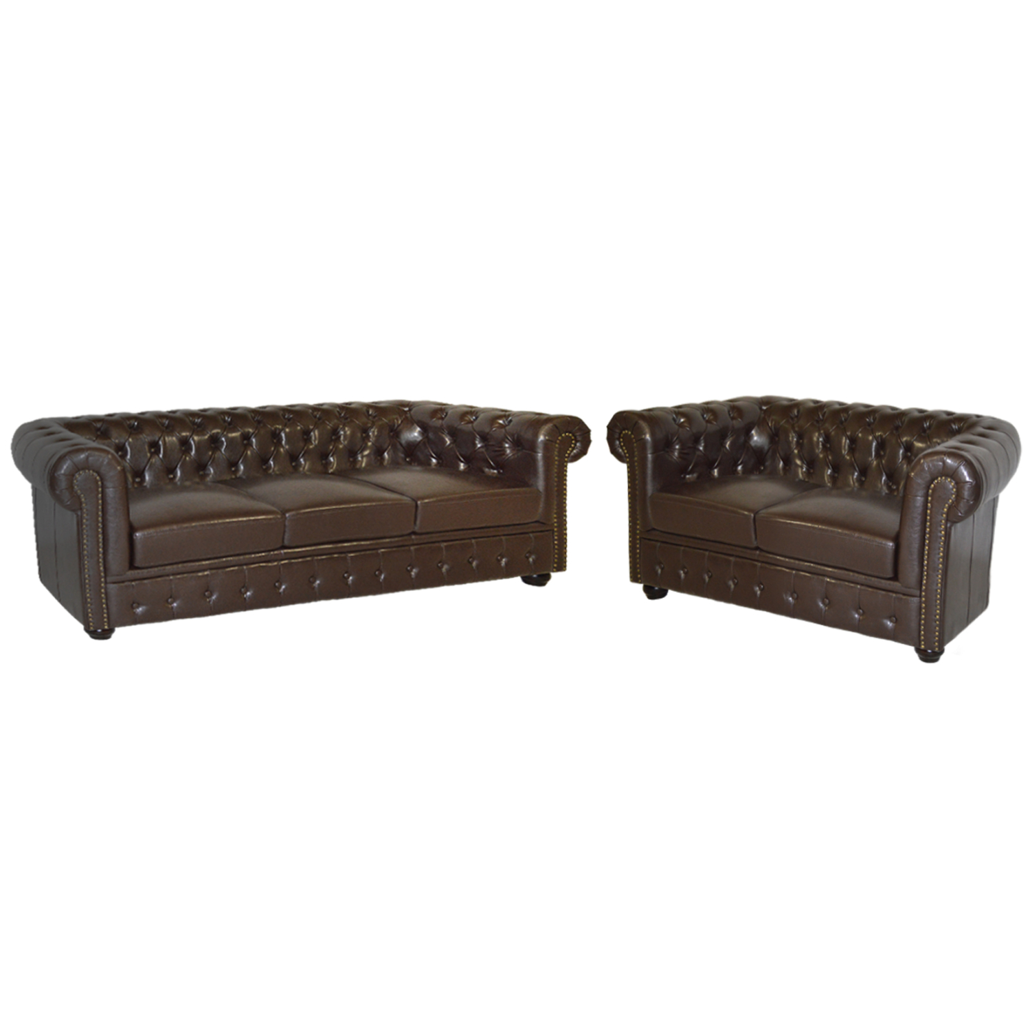 Σετ σαλόνι καναπές 2θέσιος + 3θέσιος, τύπου chesterfield καπιτονέ απο σκούρο καφέ γυαλιστερό τεχνόδερμα υψηλής ποιότητας με μη αποσπόμενα μαξιλάρια και ενισχυμένο ξύλινο σκελετό στο εσωτερικό του και στα πόδια .