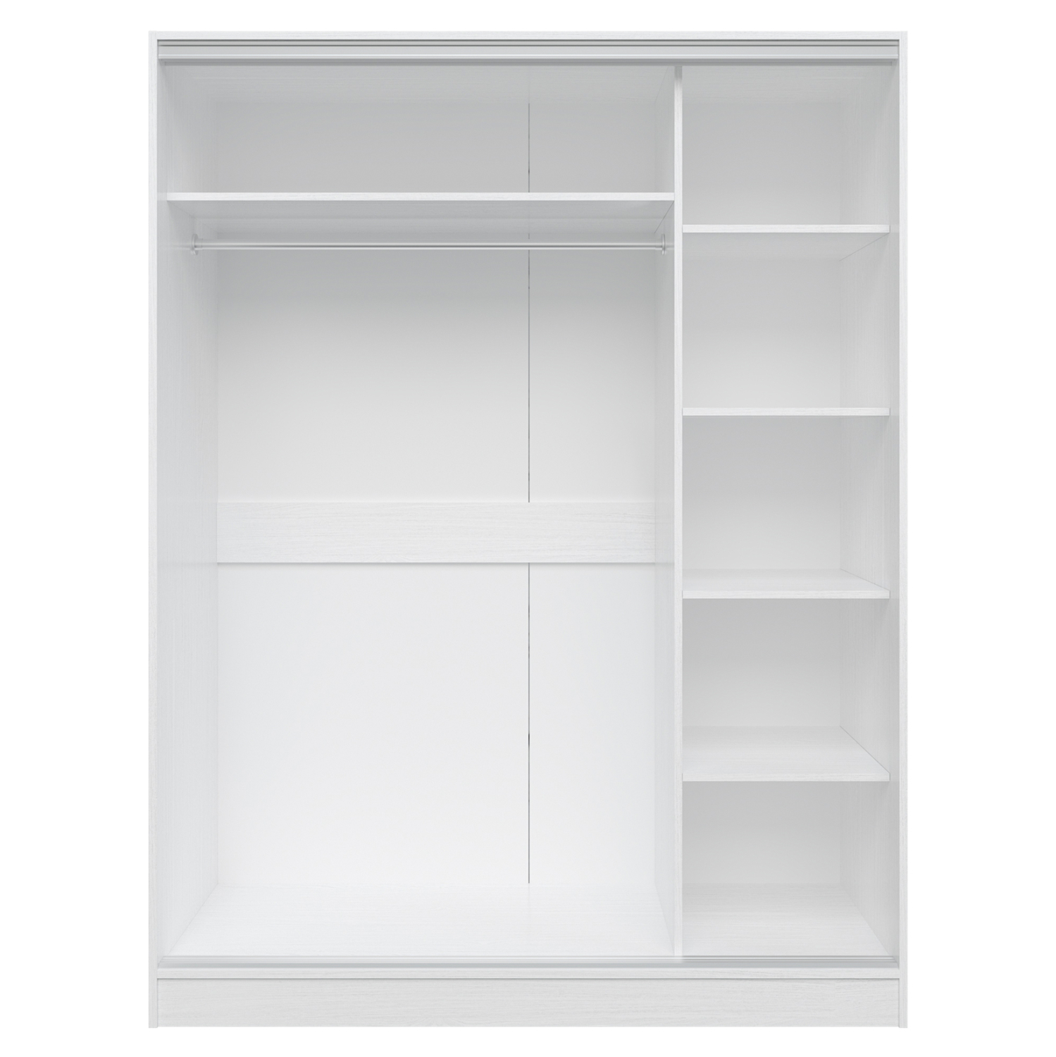 Η σύνθεση κρεβατοκάμαρας ADLER αποτελείται από α) ένα διπλό κρεβάτι, β) δύο κομοδίνα με συρταράκι κι ένα ράφι, γ) μια συρταριέρα/μπουφέ με 3 συρτάρια, 2 ντουλάπια, κι ένα ανοιχτό ράφι, δ) έναν σομιέ για το κρεβάτι με ανθεκτικές ξύλινες ανατομικές τάβλες, και τέλος ε) μια δίφυλλη ντουλάπα με συρόμενες πόρτες και ολόσωμο καθρέπτη στην μία πόρτα. Όλη η σύνθεση είναι της ίδιας σειράς σε ΛΕΥΚΟ χρώμα.