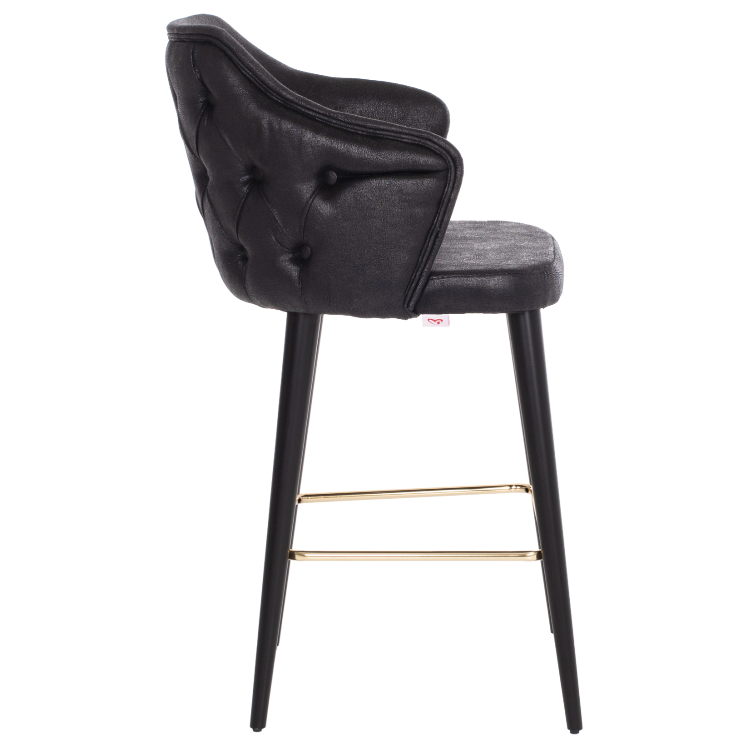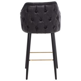Επαγγελματικό σκαμπό bar «ALONZO” σε ΜΑΥΡΟ χρώμα με μαύρα ξύλινα πόδια. Τα πόδια ενώνονται μεταξύ τους περίπου στη μέση τους με μια μεταλλική ορθογώνια ράγα σε χρυσή απόχρωση. Το «ALONZO” είναι λιτό, ποιοτικό και κομψό στην όψη, και σίγουρα τραβάει τα βλέμματα με το ύφασμα τύπου NUBUCK που είναι επενδυμένο. Είναι ψηλό με πλάτη και μπράτσα, ενώ στο πίσω μέρος του έχει καπιτονέ τεχνοτροπία, πράγμα που επιτείνει τον ιδιαίτερο χαρακτήρα αυτού του σκαμπό.
