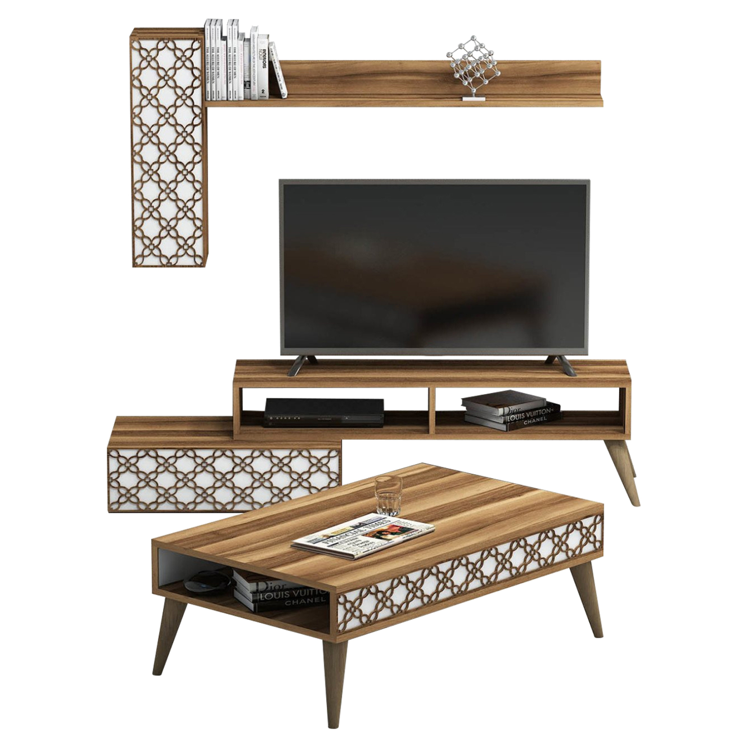 Η σύνθεση ΗΜ11850.03 θα αλλάξει την όψη στο σαλόνι σας και θα σας προσφέρει την αναβάθμιση που θέλετε. Αποτελείται από έναν συνδυασμό επίπλων για την τηλεόρασή σας με μονάδα δαπέδου, επιτοίχιο ράφι και επιτοίχιο ντουλάπι, και ένα τραπεζάκι σαλονιού. Όλη η σύνθεση είναι της ίδιας σειράς με συνδυασμό χρωμάτων ΚΑΡΥΔΙ με ΛΕΥΚΟ.