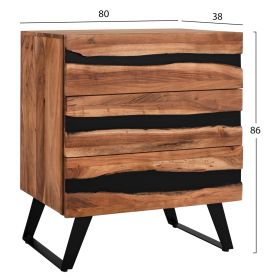 Χειροποίητη συρταριέρα από μασίφ ξύλο Ακακίας σε φυσική απόχρωση και μεταλλικά πόδια σε μαύρο χρώμα.