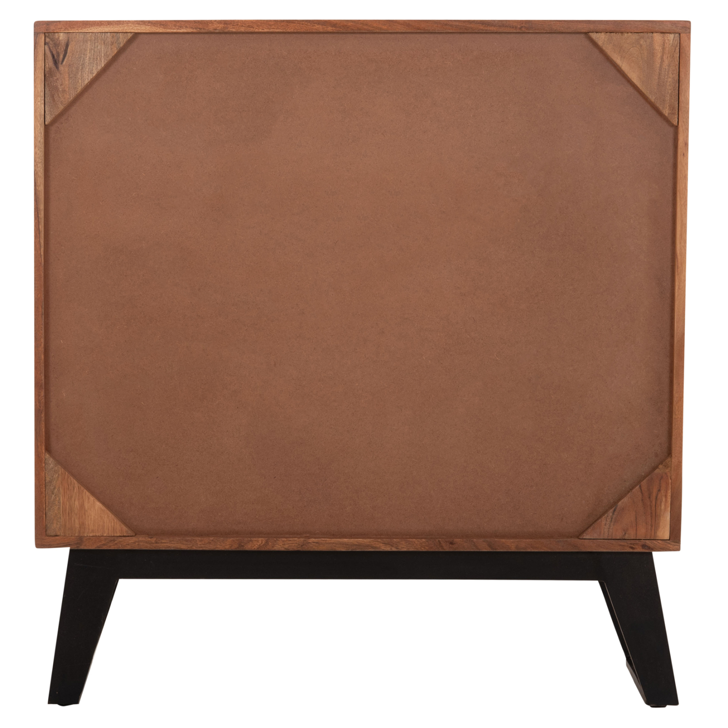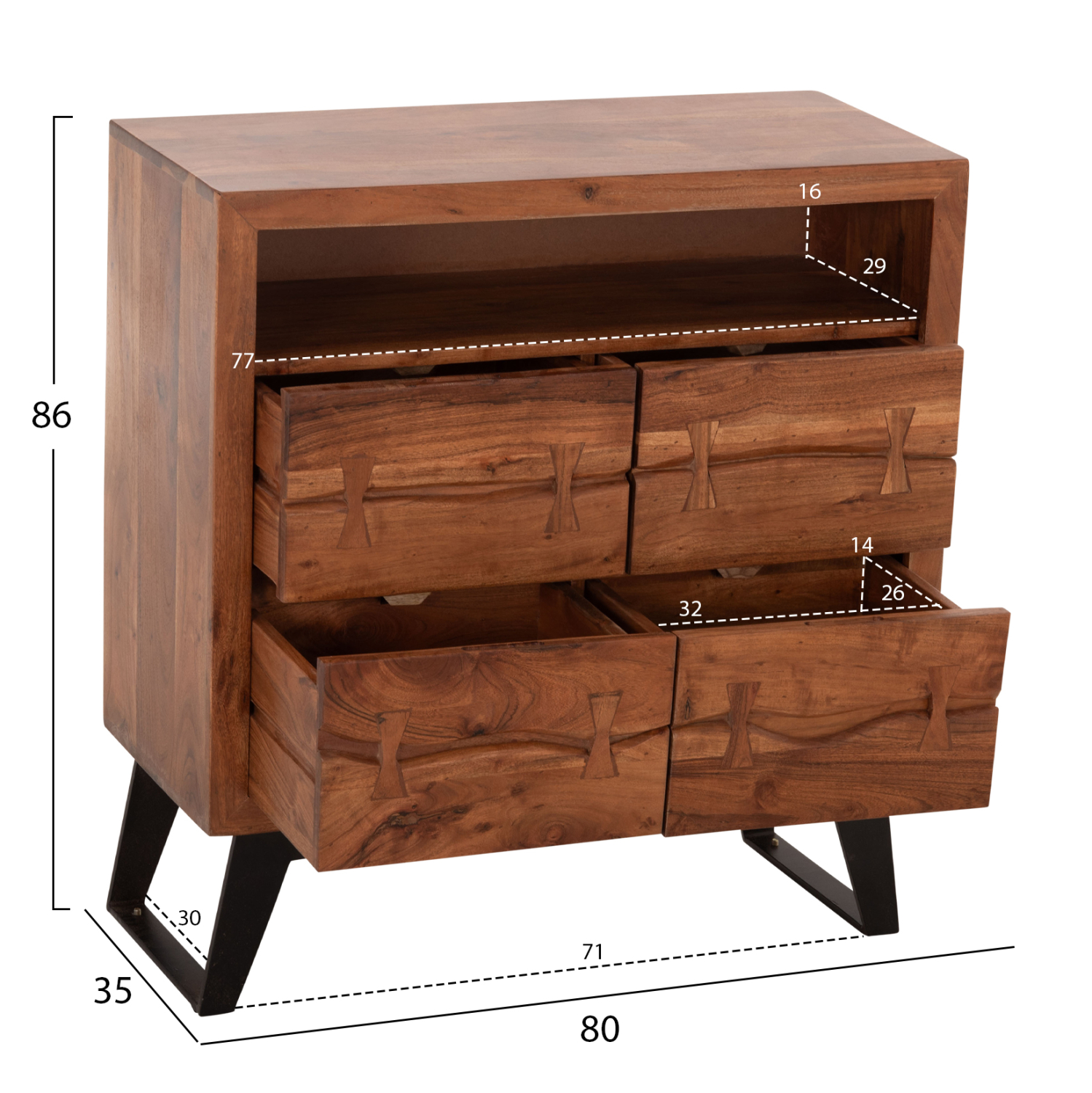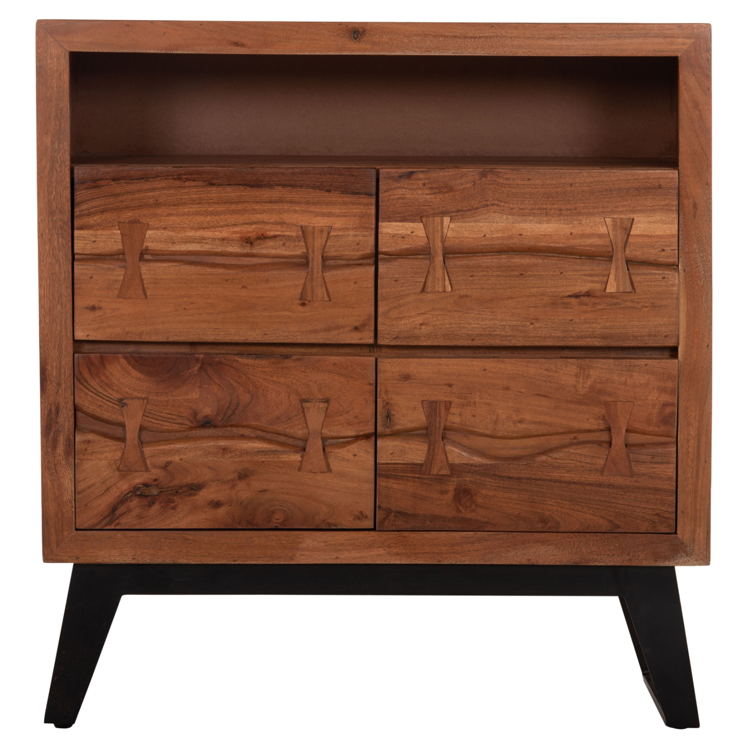 Χειροποίητη συρταριέρα από μασίφ ξύλο Ακακίας σε φυσική απόχρωση και μεταλλικά πόδια σε μαύρο χρώμα.