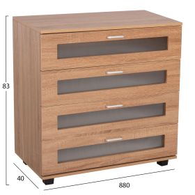 Η THORGAN είναι μια μεγάλη συρταριέρα με 4 φαρδιά συρτάρια που θα ικανοποιήσει όλες τις ανάγκες σας. Έχει ουδέτερο χρώμα ΣΟΝΟΜΑ με χερούλια σε ασημί απόχρωση. To χαρακτηριστικό που κάνει αυτή την συρταριέρα να ξεχωρίζει είναι ότι τα συρτάρια έχουν παραθυράκια από ημιδιαφανές πολυκαρβονικό γυαλί. Τα μαύρα ποδαράκια της συρταριέρας, είναι σταθερά και φαρδιά προσφέροντας στιβαρότητα στην κατασκευή και ταυτόχρονα δημιουργούν μια ευχάριστη διχρωμία με το κυρίως σώμα της συρταριέρας.