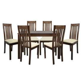 6 Καρέκλες ξύλινες σε σκούρο καρυδί χρώμα και με εκρού ύφασμα στο κάθισμα. Η καρέκλα διατίθεται σε πακέτο ασυναρμολόγητη.