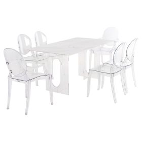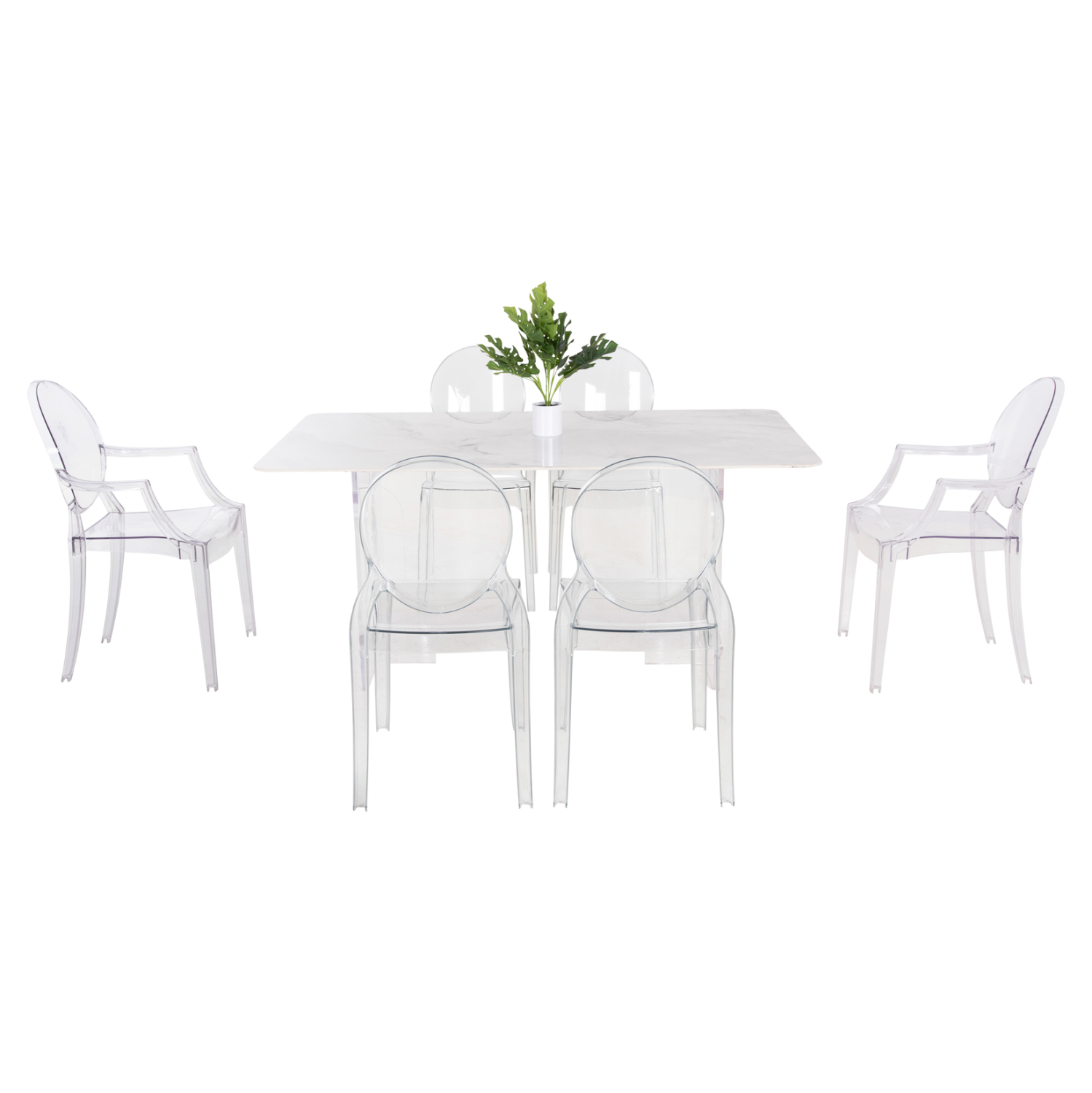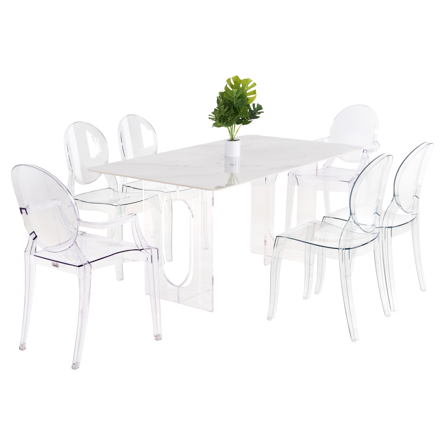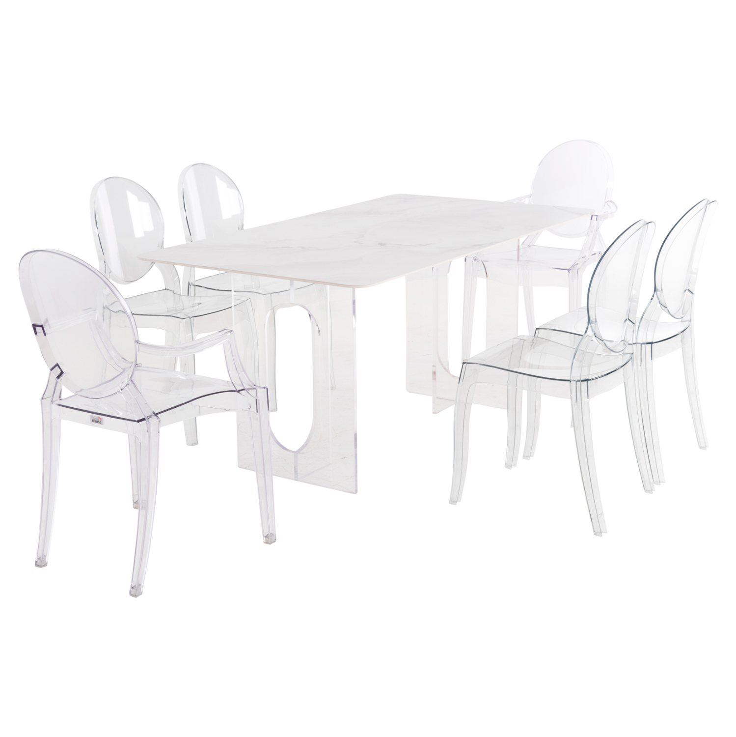 Αυτό το σετ τραπεζαρίας εσωτερικού χώρου είναι πολύ ιδιαίτερο. Αποτελείται από ένα τραπέζι, 2 πολυθρόνες, και 4 καρέκλες. Το AETHER είναι ένα ορθογώνιο τραπέζι τραπεζαρίας με κεραμική επιφάνεια από νεφρίτη σε ΛΕΥΚΟ χρωματισμό. Η επιφάνεια αυτή είναι μονταρισμένη σε δύο ακρυλικές διάφανες βάσεις που δίνουν στο τραπέζι μια αίσθηση πολυτέλειας και καθαρότητας. Οι 2 πολυθρόνες καθώς και οι 4 καρέκλες ARAMIS είναι εντελώς διάφανες από χυτό ακρυλικό υλικό υψηλής αντοχής, και δημιουργούν την τέλεια σύνθεση με το τραπέζι.