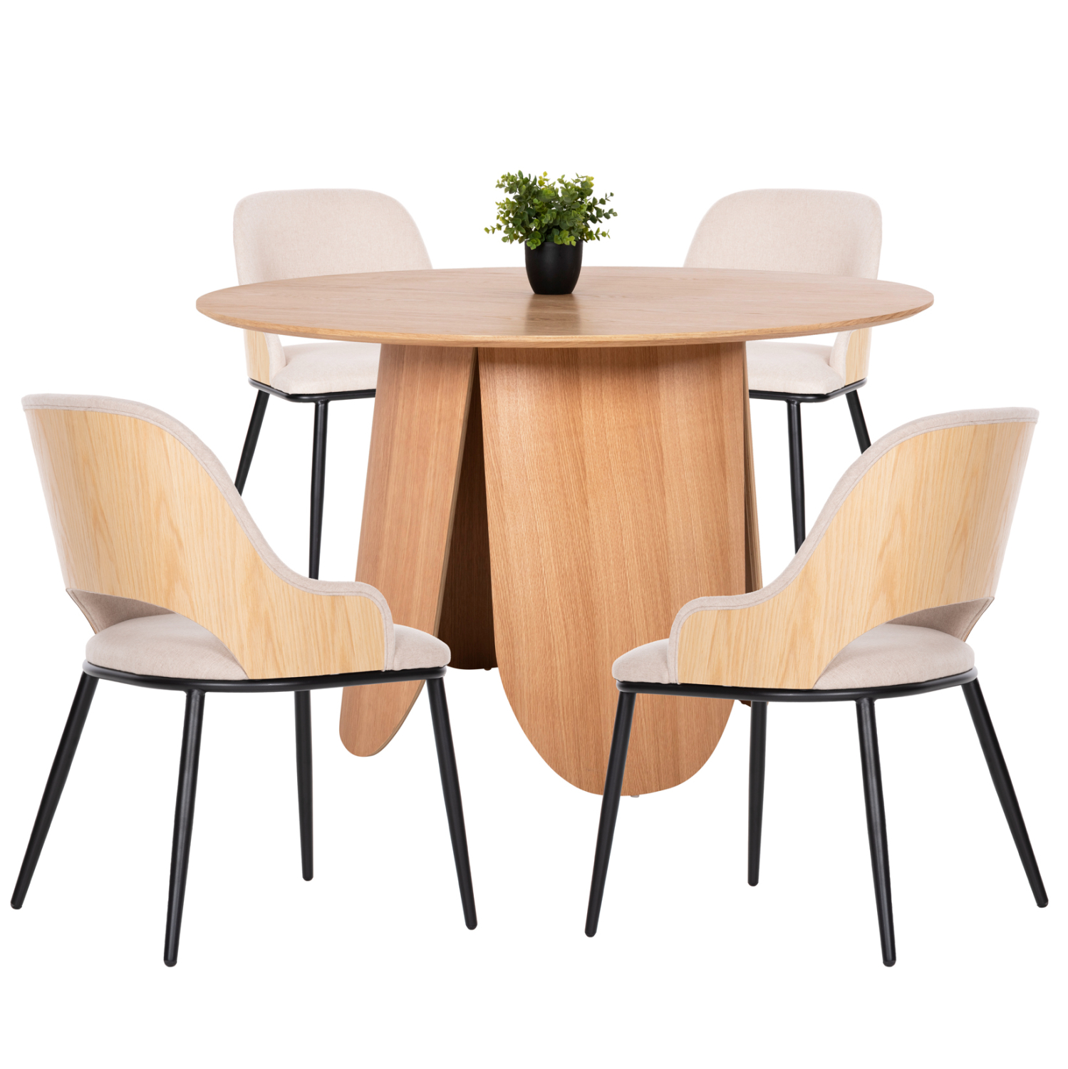 Αυτό το σετ τραπεζαρίας εσωτερικού χώρου αποτελείται από ένα τραπέζι DENTY και 4 καρέκλες DELF. Το DENTY είναι ένα στρογγυλό τραπέζι για την τραπεζαρία, με φαλτσοκομμένη επιφάνεια από MDF με καπλαμά δρυός σε ΦΥΣΙΚΟ χρώμα ΔΡΥΟΣ. Η επιφάνεια αυτή στηρίζεται σε μία πανέμορφη ξύλινη κυλινδρική βάση με ίδιο χρωματισμό. Οι καρέκλες DELF έχουν επένδυση με ύφασμα σε ΜΠΕΖ απόχρωση και ΜΑΥΡΑ μεταλλικά πόδια. Αυτό, όμως, που ξεχωρίζει είναι ότι ολόκληρη η πλάτη είναι ξύλινη σε χρώμα ΔΡΥΟΣ (OAK) κι είναι κυρτή και αναπαυτική.