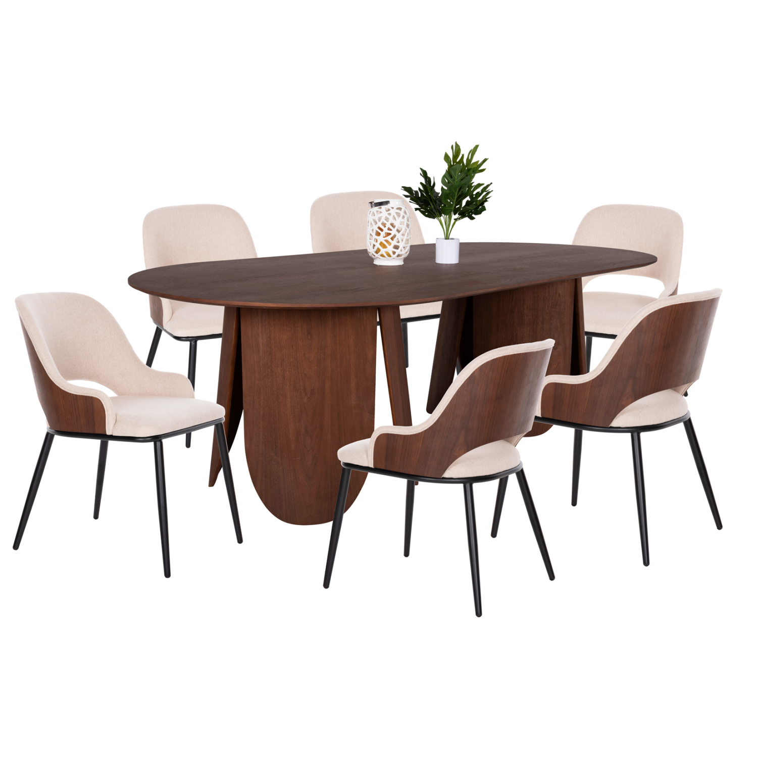Αυτό το σετ τραπεζαρίας εσωτερικού χώρου αποτελείται από ένα τραπέζι DENTY και 6 καρέκλες DELF. Το DENTY είναι ένα μεγάλο οβάλ τραπέζι για την τραπεζαρία, με φαλτσοκομμένη επιφάνεια από MDF με καπλαμά δρυός σε ΚΑΡΥΔΙ χρώμα. Η επιφάνεια αυτή στηρίζεται σε 2 πανέμορφες ξύλινες κυλινδρικές βάσεις με ίδιο χρωματισμό. Οι καρέκλες DELF έχουν κάθισμα και πλάτη από ύφασμα σε ΜΠΕΖ απόχρωση και ΜΑΥΡΑ μεταλλικά πόδια. Αυτό, όμως, που ξεχωρίζει είναι ότι ολόκληρη η πλάτη είναι ξύλινη σε ΚΑΡΥΔΙ χρώμα κι είναι κυρτή και αναπαυτική.