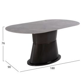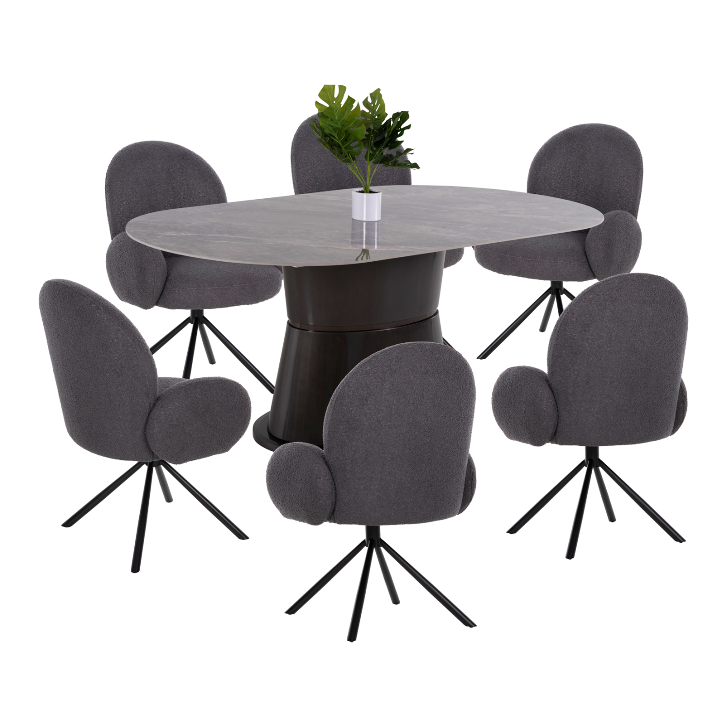Αυτό το σετ τραπεζαρίας εσωτερικού χώρου αποτελείται από ένα τραπέζι BENT και 6 πολυθρόνες WINON. Το BENT είναι ένα μεγάλο τραπέζι τραπεζαρίας με μακρύ οβάλ σχήμα επιφανείας, η οποία στηρίζεται σε μια πανέμορφη οβάλ βάση. Η επιφάνεια είναι κεραμική υψηλής ποιότητας από σχιστόλιθο σε χρωματισμό ΓΚΡΙ ΜΑΡΜΑΡΟΥ, ενώ η βάση είναι σε ΑΝΘΡΑΚΙ χρώμα από MDF. Οι πολυθρόνες WINON σε ΣΚΟΥΡΟ ΓΚΡΙ χρώμα στηρίζονται σε μια μαύρη μεταλλική σαγρέ τετράνυχη βάση στην οποία είναι τοποθετημένος ο πίρος περιστροφής, καθώς το ιδιαίτερο χαρακτηριστικό τους, είναι ότι η περιστρέφονται κατά 180 μοίρες και όχι πλήρως, και διαθέτουν αυτόματη επαναφορά στην αρχική τους θέση. Η επένδυση τους έχει γίνει με υψηλής ποιότητας TEDDY ύφασμα.