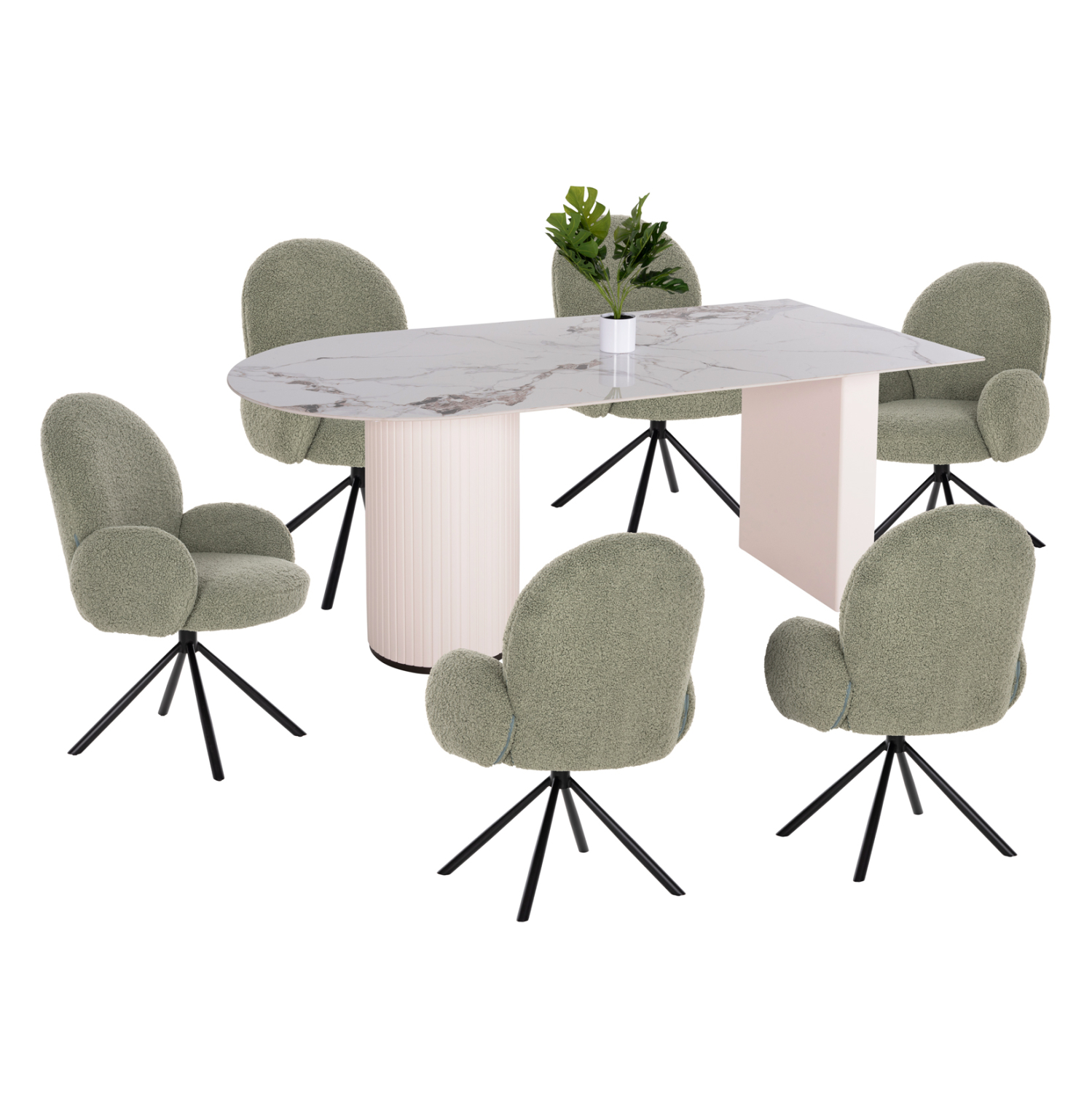 Αυτό το σετ τραπεζαρίας εσωτερικού χώρου αποτελείται από ένα τραπέζι CERAMUS και 6 πολυθρόνες WINON. Το CERAMUS είναι ένα μεγάλο τραπέζι τραπεζαρίας με διαφορετικό σχήμα στις δύο πλευρές της επιφάνειας. Οβάλ η μία πλευρά, και με ορθές γωνίες η άλλη πλευρά. Τα πόδια, είναι επίσης σε διαφορετικό στυλ για να ταιριάζουν με τις πλευρές της επιφάνειας. Στρογγυλή κολώνα το ένα πόδι, και ορθογώνια βάση στην άλλη πλευρά. Η επιφάνεια είναι κεραμική υψηλής ποιότητας σε χρωματισμό ΛΕΥΚΟΥ ΜΑΡΜΑΡΟΥ, ενώ τα πόδια είναι σε ΛΕΥΚΟ χρώμα από MDF. Οι πολυθρόνες WINON σε OLIVE GREEN χρώμα στηρίζονται σε μια μαύρη μεταλλική σαγρέ τετράνυχη βάση στην οποία είναι τοποθετημένος ο πίρος περιστροφής, καθώς το ιδιαίτερο χαρακτηριστικό τους, είναι ότι η περιστρέφονται κατά 180 μοίρες και όχι πλήρως, και διαθέτουν αυτόματη επαναφορά στην αρχική τους θέση. Η επένδυση τους έχει γίνει με υψηλής ποιότητας TEDDY ύφασμα.