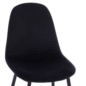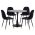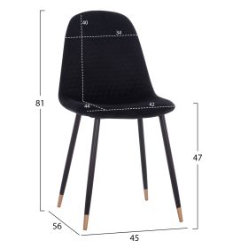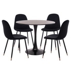 Ένα στρογγυλό τραπέζι με ΜΑΥΡΗ μεταλλική βάση και επιφάνεια από MDF σε ΜΑΥΡΟ χρώμα, και 4 καρέκλες με βελούδινη επένδυση σε ΜΑΥΡΟ χρώμα με ΜΑΥΡΑ μεταλλικά πόδια με χρυσές λεπτομέρειες στο κάτω μέρος.