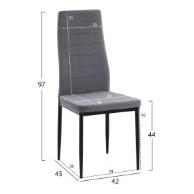 Ένα ορθογώνιο τραπέζι με σκελετό μεταλλικό σε ΜΑΥΡΟ χρώμα και κεραμική επιφάνεια με όψη ΓΚΡΙ ΜΑΡΜΑΡΟΥ, και 4 καρέκλες με ψηλή πλάτη και κάθισμα με επένδυση από βελούδινο ύφασμα σε ΓΚΡΙ χρώμα και μεταλλικό σκελετό σε ΜΑΥΡΟ χρώμα.
