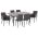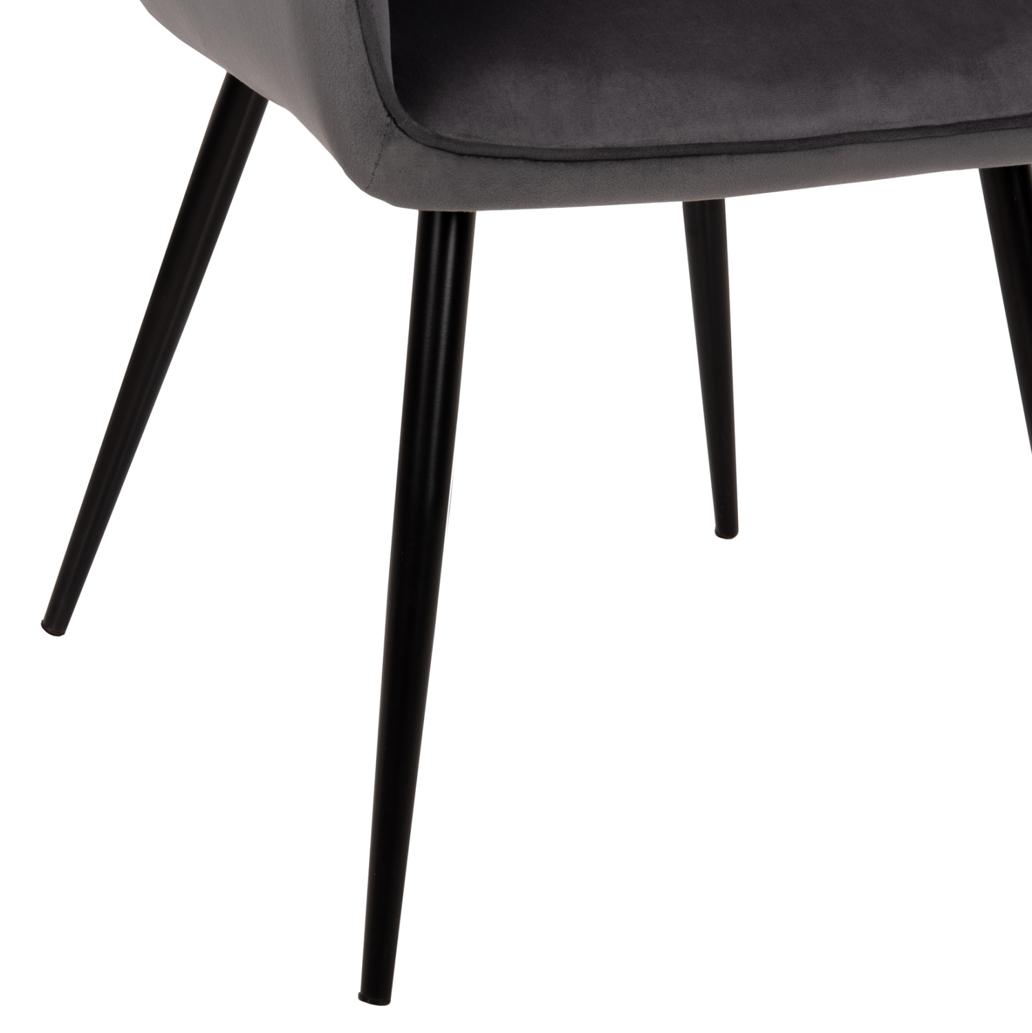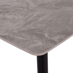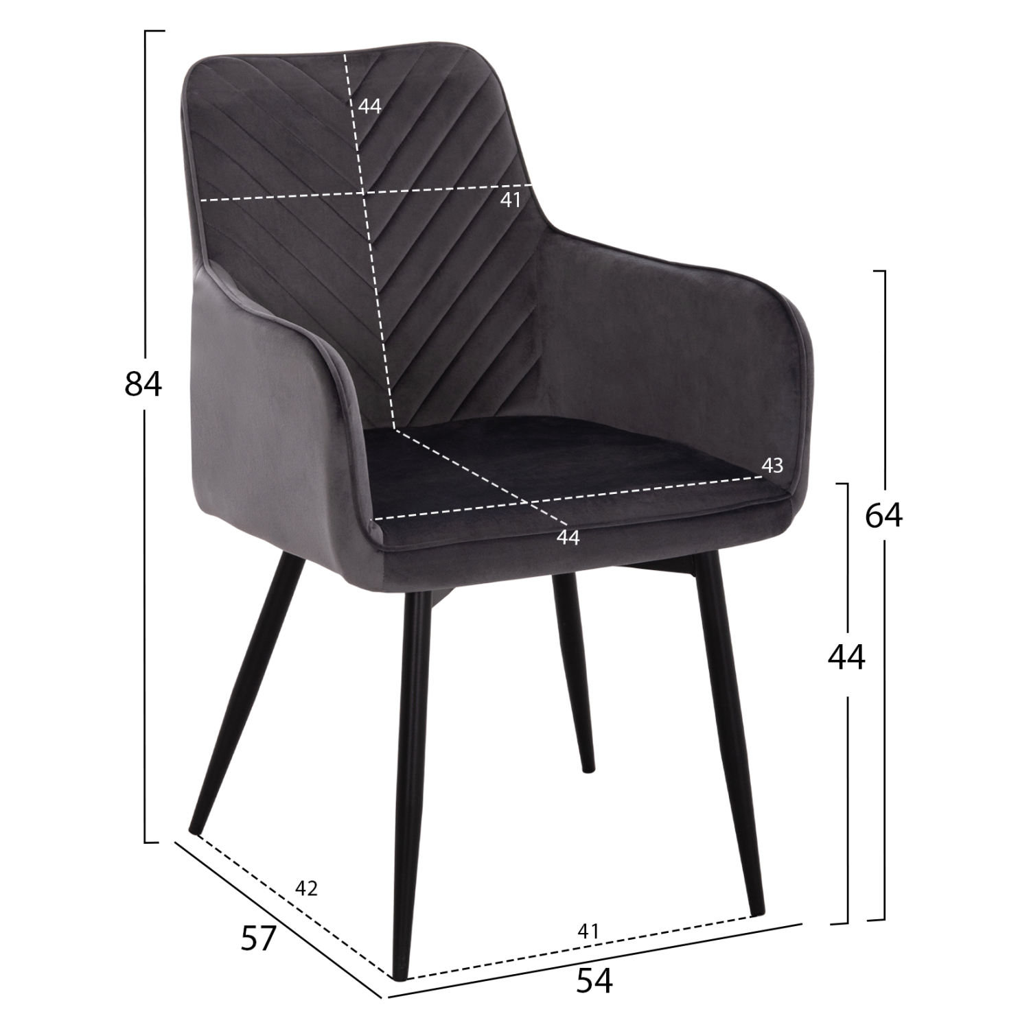 Ένα ορθογώνιο τραπέζι με σκελετό μεταλλικό σε ΜΑΥΡΟ χρώμα και κεραμική επιφάνεια με όψη ΓΚΡΙ ΜΑΡΜΑΡΟΥ, και 4 καρέκλες ΚΑΙ 2 πολυθρόνες με πλάτη και κάθισμα με επένδυση από βελούδινο ύφασμα σε ΣΚΟΥΡΟ ΓΚΡΙ χρώμα και μεταλλικά πόδια σε ΜΑΥΡΟ χρώμα.