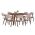 Ένα τετράγωνο τραπέζι με ιδιαίτερο χαρακτηριστικό ότι η απόχρωση της φαλτσοκομμένης επιφάνειας αλλά και των ποδιών είναι ΣΚΟΥΡΑ ΚΑΡΥΔΙ σε sunburst τεχνοτροπία του καπλαμά καρυδιάς, και 8 καρέκλες από ποιοτικό μασίφ rubberwood (καουτσουκόδεντρο) σε ΚΑΡΥΔΙ χρώμα με επένδυση καθίσματος και πλάτης από ύφασμα σε ΕΚΡΟΥ χρώμα.