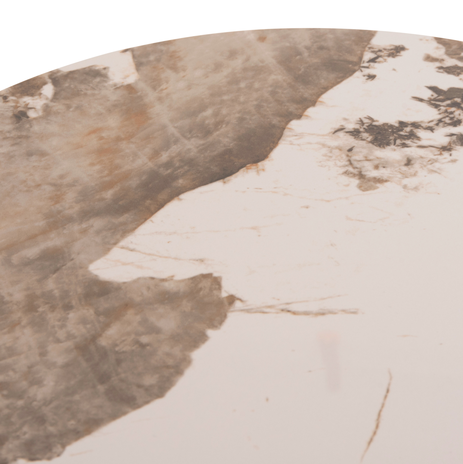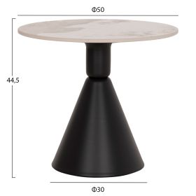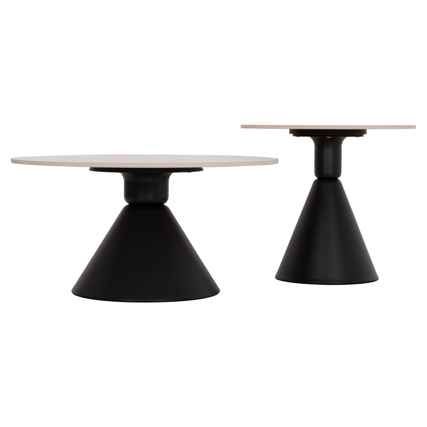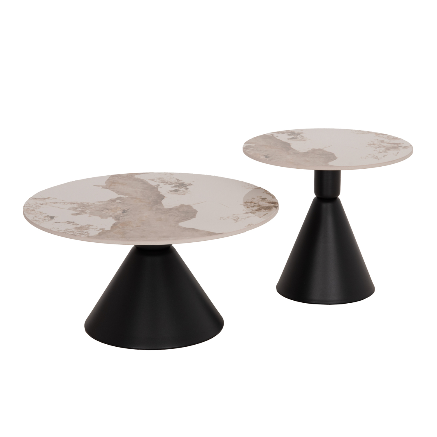 Αυτό το σετ τραπεζιών για το σαλόνι αποτελείται από 2 μεταλλικά τραπεζάκια στρογγυλά διαφορετικών μεγεθών. Οι βάσεις τους έχουν σχήμα κώνου σε ΜΑΥΡΟ χρώμα, ενώ οι επιφάνειες είναι κατασκευασμένες από γυαλιστερό sintered stone σε χρωματικό σχήμα pandora. Ιδανικά τόσο για το σπίτι, όσο και για επαγγελματικούς χώρους.