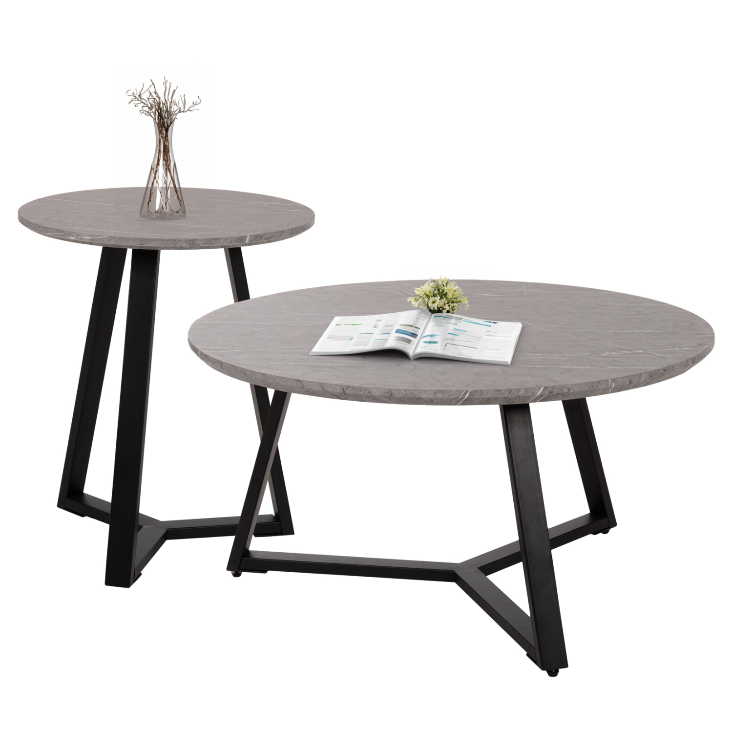 Ανακαλύψτε το σετ 2 στρογγυλών τραπεζιών σαλονιού ROCKET. Πρόκειται για 2 τραπεζάκια με διαφορετικές διαστάσεις που θα αποτελέσουν όμορφα αλλά και χρήσιμα στοιχεία στον χώρο σας. Οι επιφάνειες στηρίζονται σε μοντέρνες τρίποδες μεταλλικές βάσεις σε ΜΑΥΡΟ σαγρέ χρώμα, και είναι κατασκευασμένες από MDF σε χρώμα ΓΚΡΙ ΜΑΡΜΑΡΟΥ.
