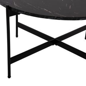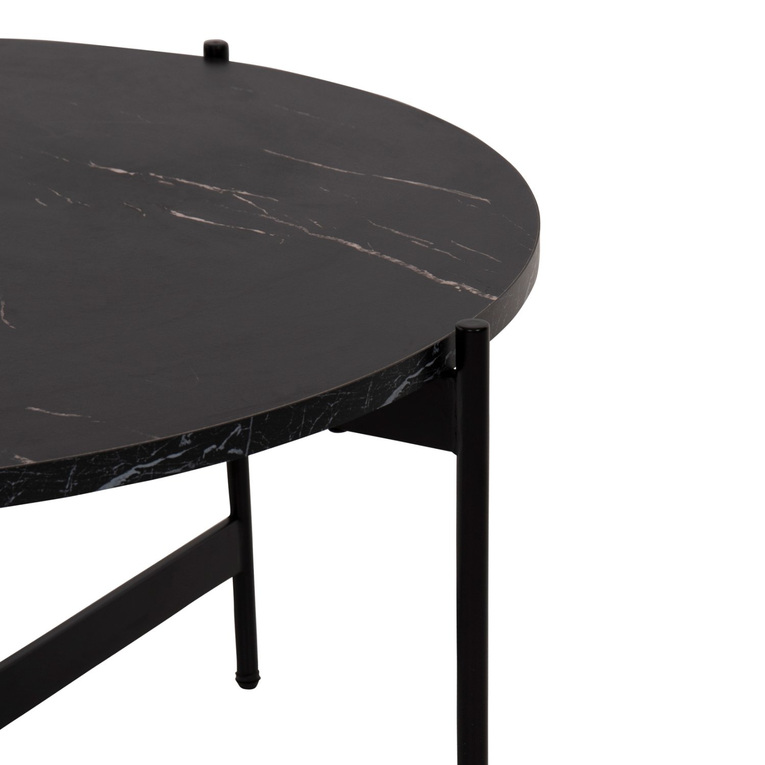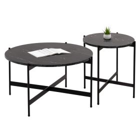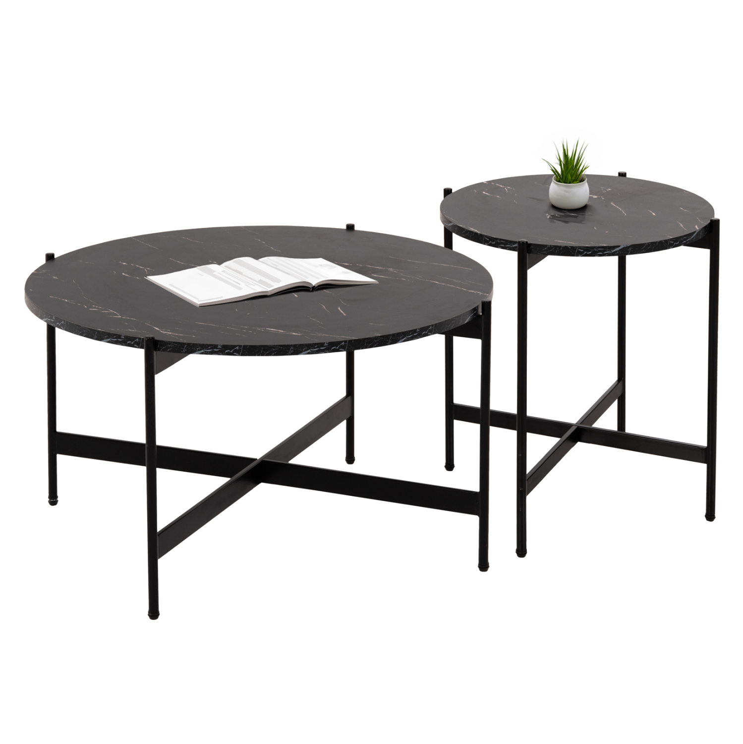 Αν ψάχνετε ένα σετ 2 τραπεζιών σαλονιού σε δύο διαφορετικές διαστάσεις, τότε το σετ RONDA θα σας ενθουσιάσει με το στυλ και την πρακτικότητά του. Πρόκειται για στρογγυλά τραπεζάκια με ιδιαίτερο χαρακτηριστικό ότι οι επιφάνειές τους στηρίζονται σε βάσεις με χιαστί διάταξη. Οι βάσεις είναι μεταλλικές σε ΜΑΥΡΟ χρώμα, ενώ οι επιφάνειες είναι κατασκευασμένες από MDF σε χρώμα ΜΑΥΡΟΥ ΜΑΡΜΑΡΟΥ.