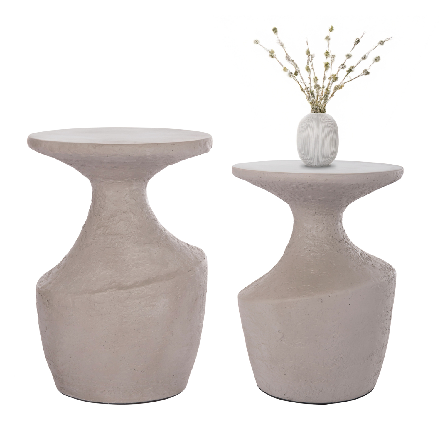 Τα 2 βοηθητικά τραπέζια σαλονιού REBON είναι στρογγυλά, διαφορετικών διαστάσεων και με μοντέρνο design. Είναι κατασκευασμένα εξολοκλήρου από Fiber Cement σε ΓΚΡΙ χρώμα με σαγρέ υφή που αποτελεί την τελευταία τάση στην εσωτερική διακόσμηση. Ιδανικό συμπλήρωμα τόσο για το σπίτι, όσο και για επαγγελματικούς χώρους, όπως ξενοδοχεία, AirBnB, κτλ.