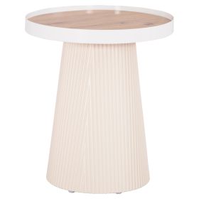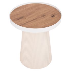 Το βοηθητικό τραπέζι DENTON είναι στρογγυλό και σχετικά ψηλό, σε χρώμα ΛΕΥΚΟ. Η επιφάνειά του είναι από MDF σε χρωματισμό ΦΥΣΙΚΟΥ ΞΥΛΟΥ μονταρισμένη σε έναν μεταλλικό δίσκο με υπερυψωμένη περίμετρο, ενώ η βάση του είναι κωνική κατασκευασμένη εξολοκλήρου από MDF, με όμορφες πτυχώσεις. Ιδανικό για πληθώρα χώρων χάρη στην πρακτικότητά του.