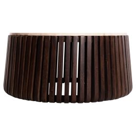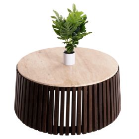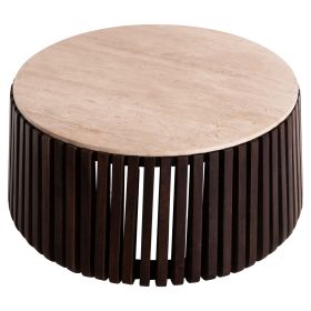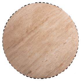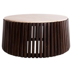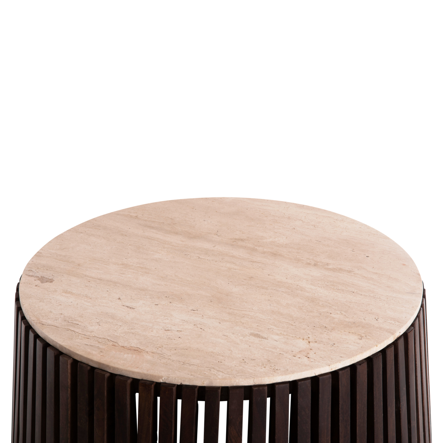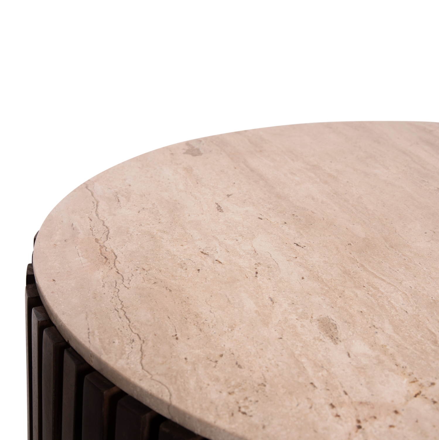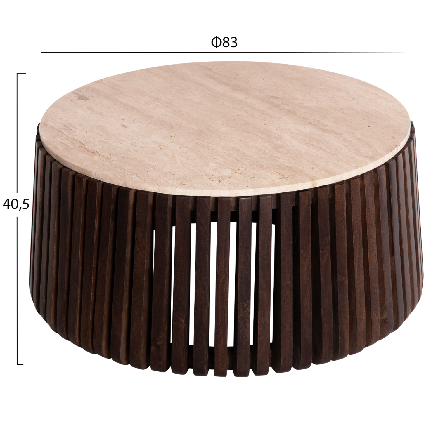 Το KREST είναι ένα στρογγυλό τραπέζι για το σαλόνι σε ΚΑΦΕ χρώμα με επιφάνεια από τραβερτίνα στο ΛΕΥΚΟ της χρώμα. Αποτελείται από ξύλινες δοκούς σε κωνική διάταξη που καταλήγουν σε μια κυκλική βάση, πάνω στην οποία τοποθετείται η πέτρινη επιφάνεια. Πρόκειται για ένα πολυτελέστατο τραπέζι για το σαλόνι σας που θα τραβήξει τα βλέμματα!