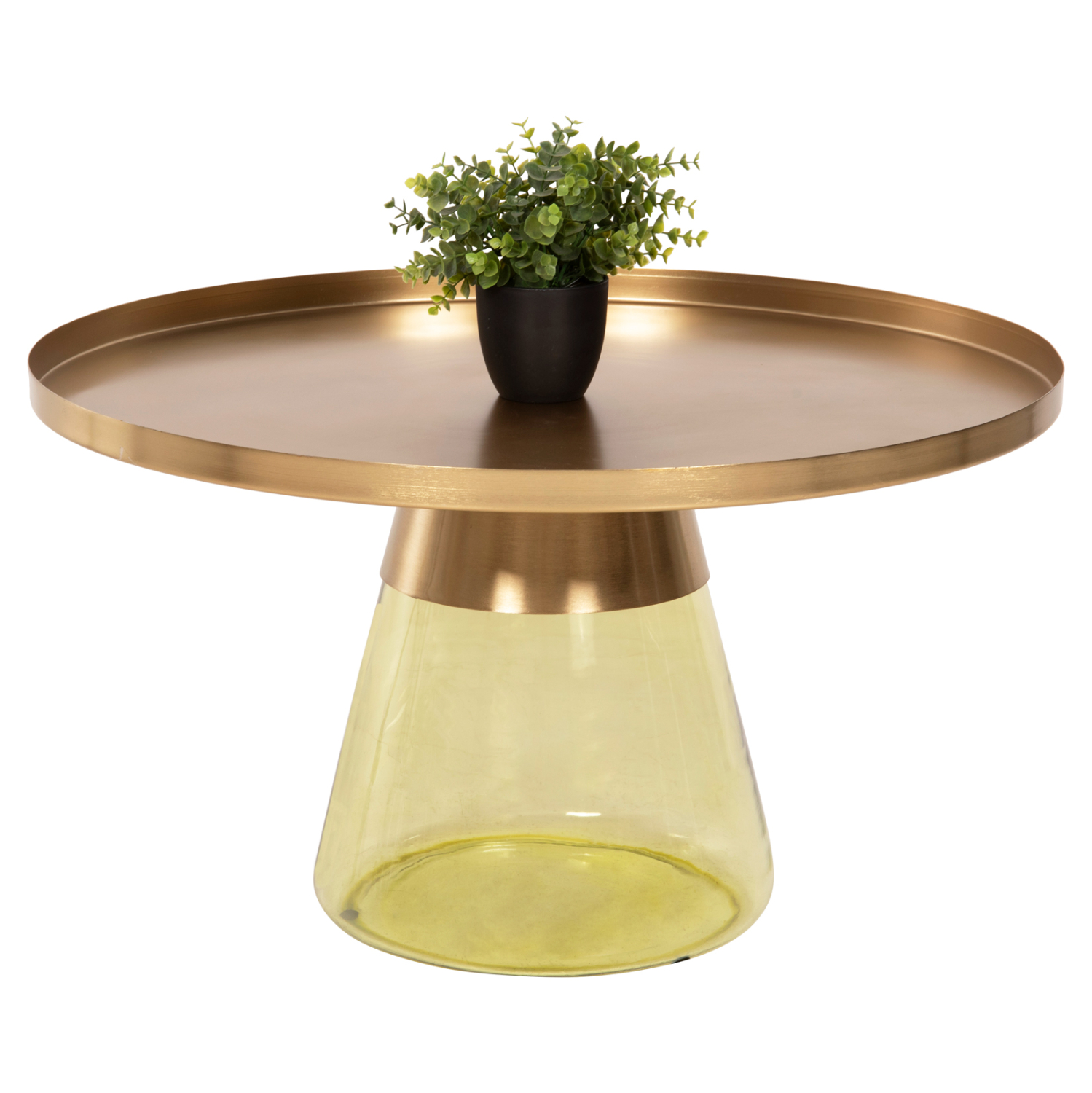 Ανακαλύψτε το εξαιρετικό τραπέζι σαλονιού SCAL. Είναι στρογγυλό με γυάλινη κωνική βάση σε διαφανές ΠΡΑΣΙΝΩΠΟ χρώμα και μεταλλικό «λαιμό» και top σε γυαλιστερό ΧΡΥΣΟ χρώμα. Το τραπέζι δίνει μια αίσθηση πολυτέλειας και είναι ιδανικό τόσο για το σπίτι, όσο και για επαγγελματικούς χώρους.