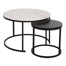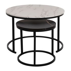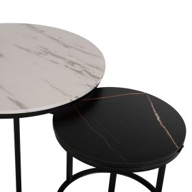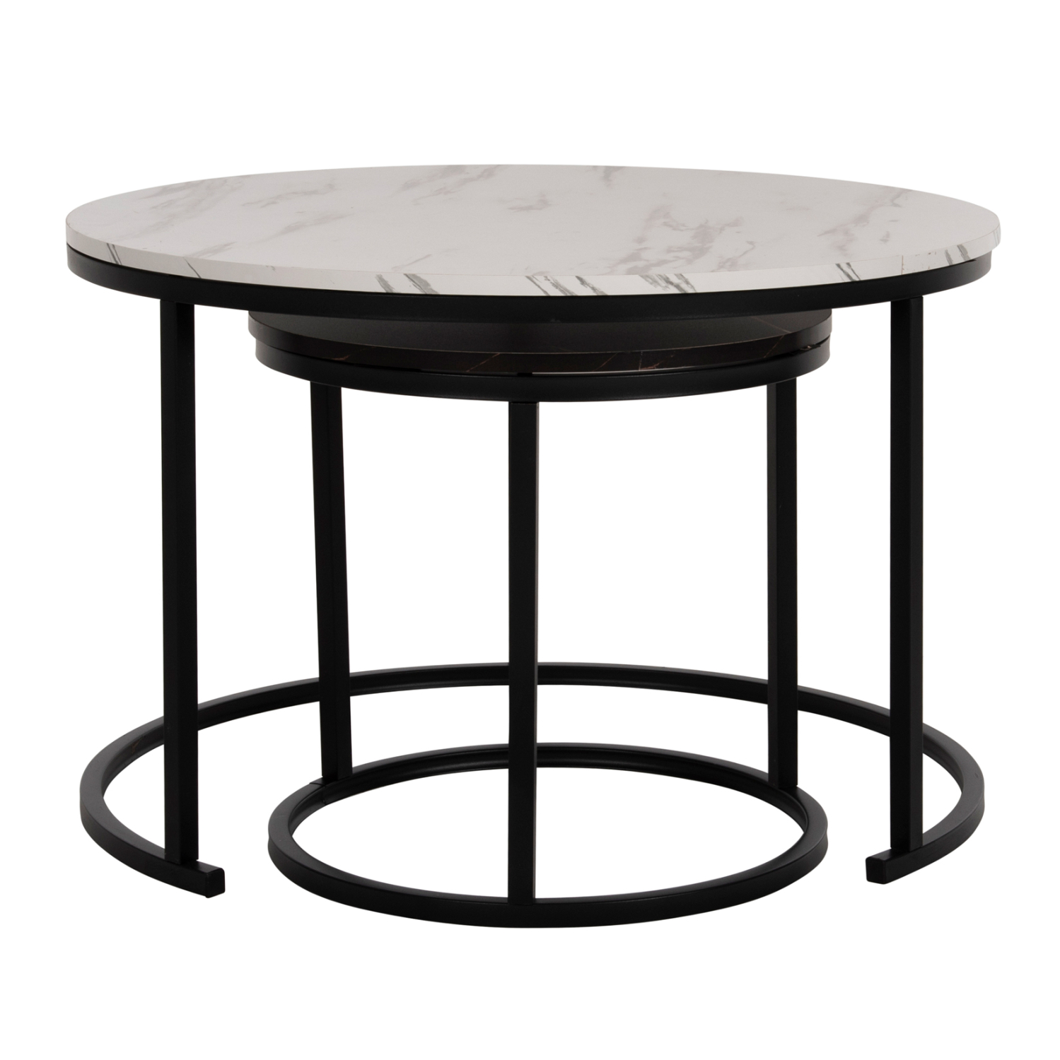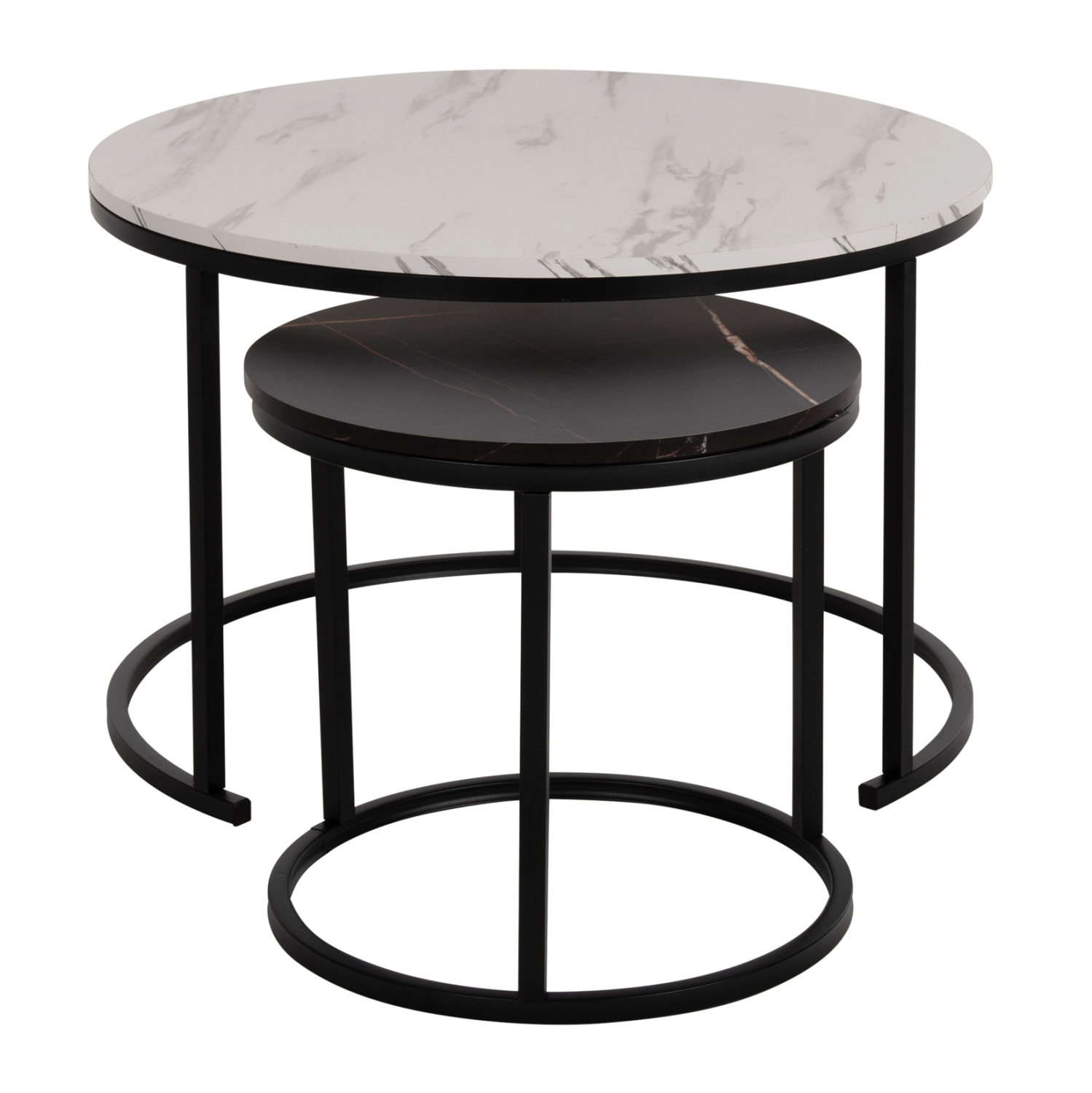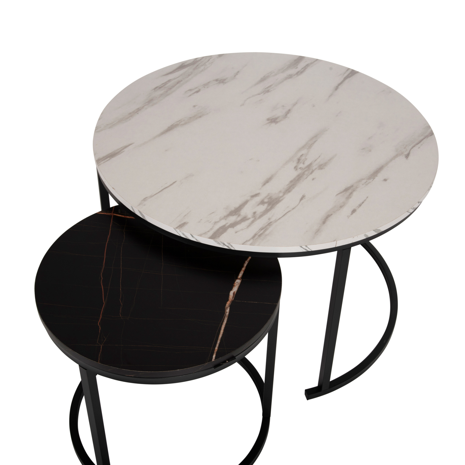 Τα τραπεζάκια ΗΜ8763.14 θα σας ενθουσιάσουν με το στυλ και την πρακτικότητά τους. Πρόκειται για 2 τραπεζάκια ένα ψηλότερο κι ένα πιο κοντό με ιδιαίτερο χαρακτηριστικό ότι το ψηλότερο στηρίζεται σε μια ημικυκλική βάση με τρία μεταλλικά πόδια, πράγμα που επιτρέπει στο πιο κοντό να χωράει και να αποθηκεύεται ακριβώς από κάτω. Οι βάσεις και των δύο τραπεζιών είναι μεταλλικές σε μαύρο χρώμα, ενώ οι επιφάνειές τους είναι διαφορετικές σε απομίμηση λευκού και μαύρου μαρμάρου από MDF.