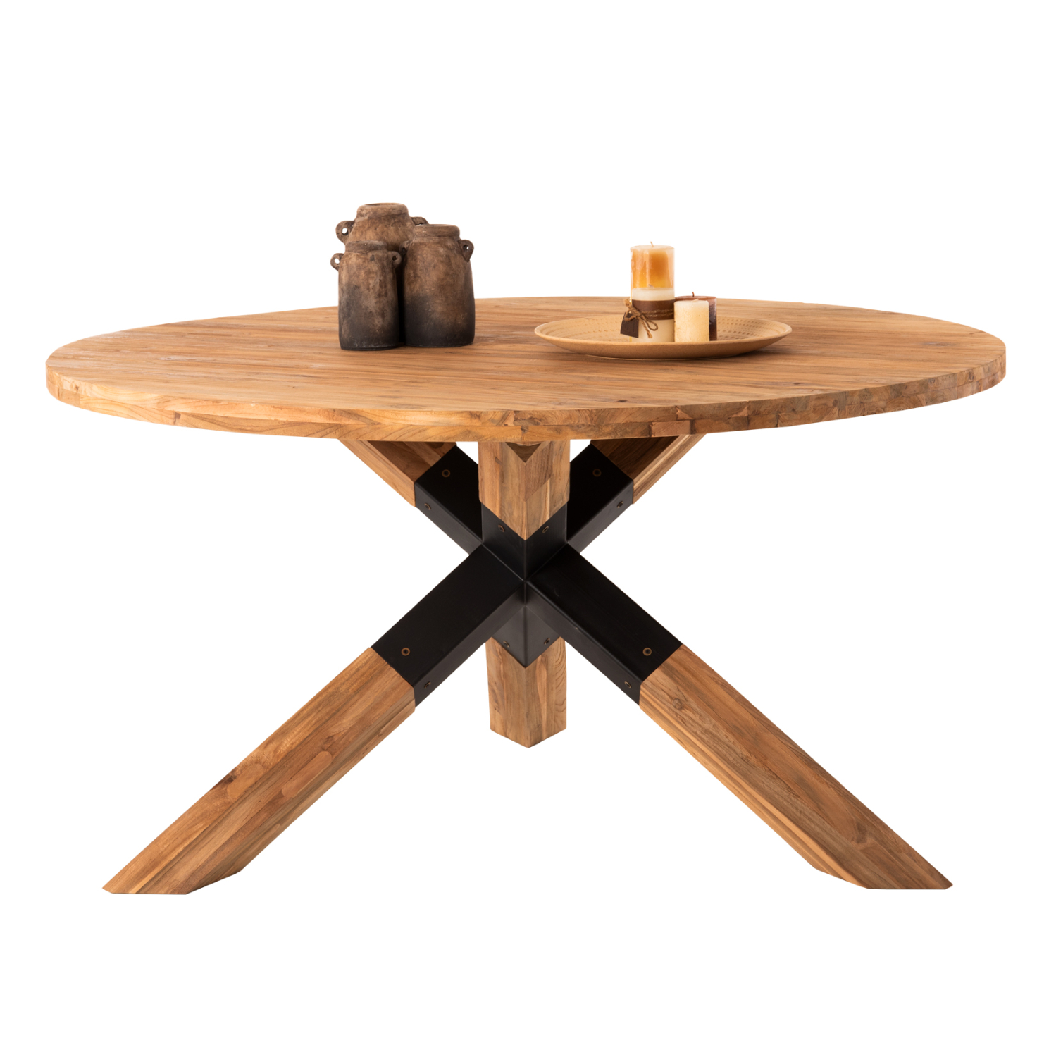 HM9559---Στρογγυλό τραπέζι, κατασκευασμένο εξολοκλήρου από μασίφ ξύλα ΤΕΑΚ στο φυσικό τους χρώμα. Στηρίζεται σε μια χιαστί σκούρα γκρι μεταλλική διάταξη ποδιών, σε συνδυασμό με ξύλο. Ένα τραπέζι που θα ενθουσιάσει τους πάντες με το ικανοποιητικό μέγεθός του και την αντοχή του. Εσείς το μόνο που έχετε να κάνετε είναι να βρείτε τις καρέκλες που θα ταιριάξουν με αυτό το υπέροχο τραπέζι! Τα τραπέζια ροτόντες είναι ιδιαιτέρως πρακτικά και όμορφα γιατί δεν έχουν κορυφές και «αρχηγούς», ούτε και γωνίες ή πόδια που, πολλές φορές, δημιουργούν άβολες καταστάσεις.