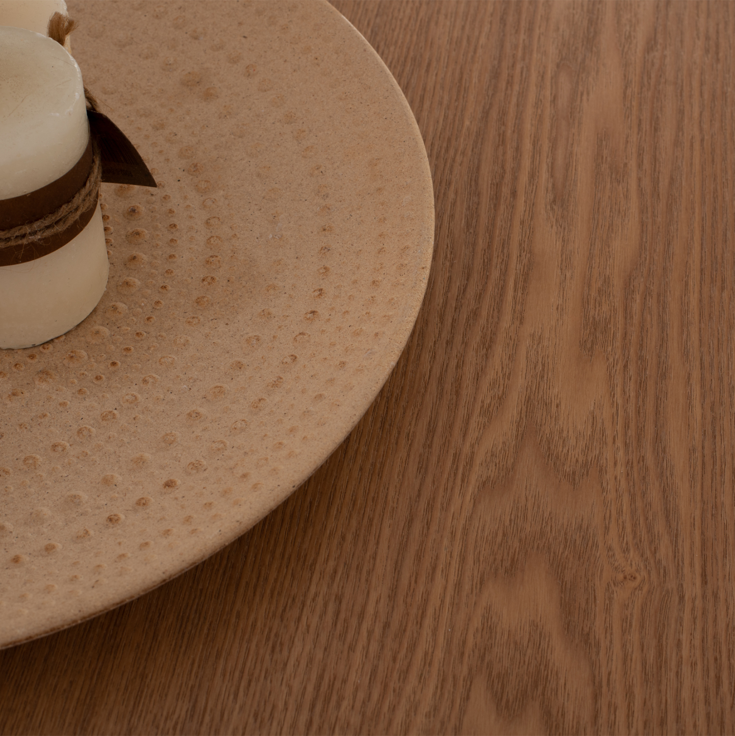 Η επιφάνεια του τραπεζιού είναι από MDF με καπλαμά από ξύλο δρυός. Το MDF (Medium Density Fiber) είναι ένα σύγχρονο υλικό ευρείας κατανάλωσης το οποίο επιλέγεται πολύ συχνά κυρίως για τον χώρο της κουζίνας. Βασικά χαρακτηριστικά του είναι ότι απορροφά ελάχιστη υγρασία, παράγοντας σημαντικός για έναν χώρο όπως αυτός της κουζίνας, διαθέτει ομοιογένεια στην μάζα του, ικανοποιητικές μηχανικές ιδιότητες, εξαιρετική ομαλότητα και πολλές δυνατότητες επεξεργασίας.