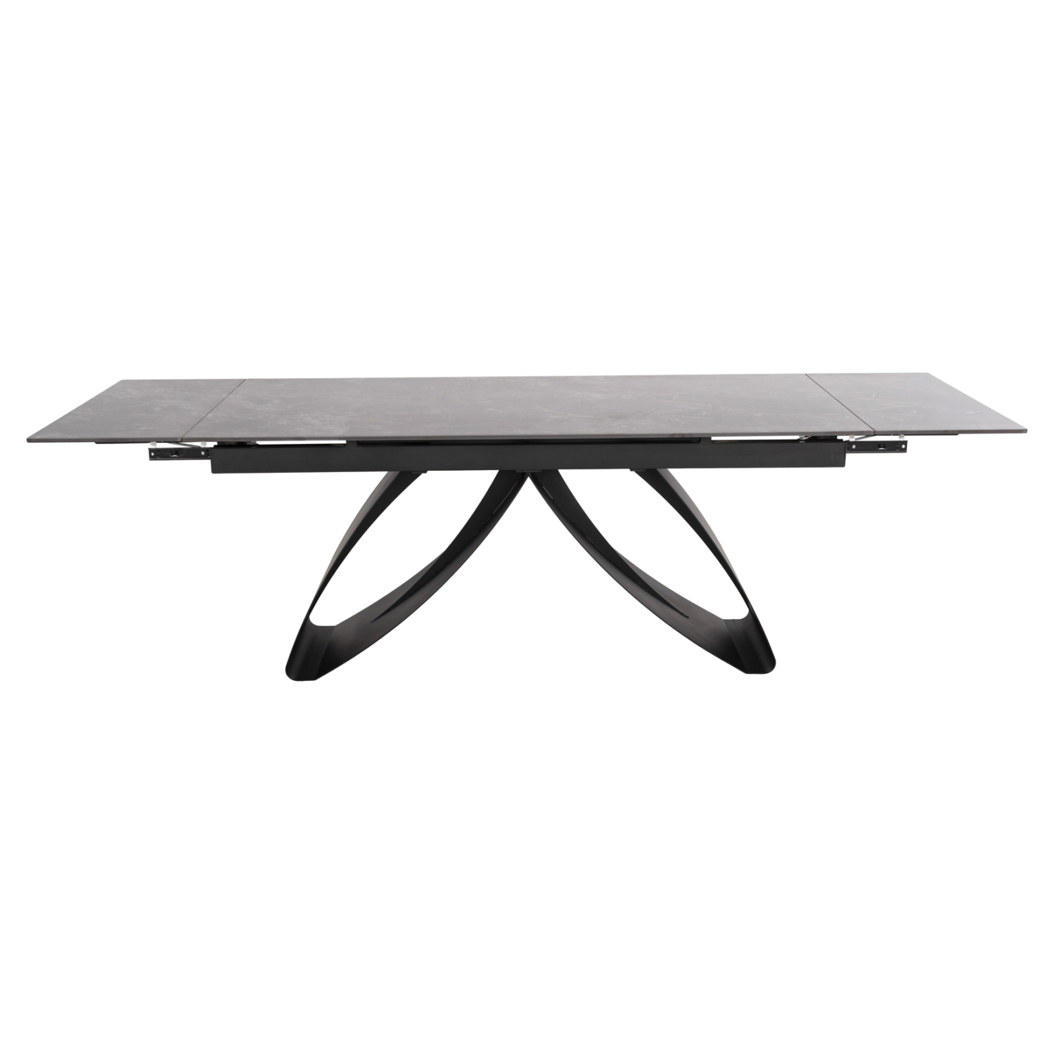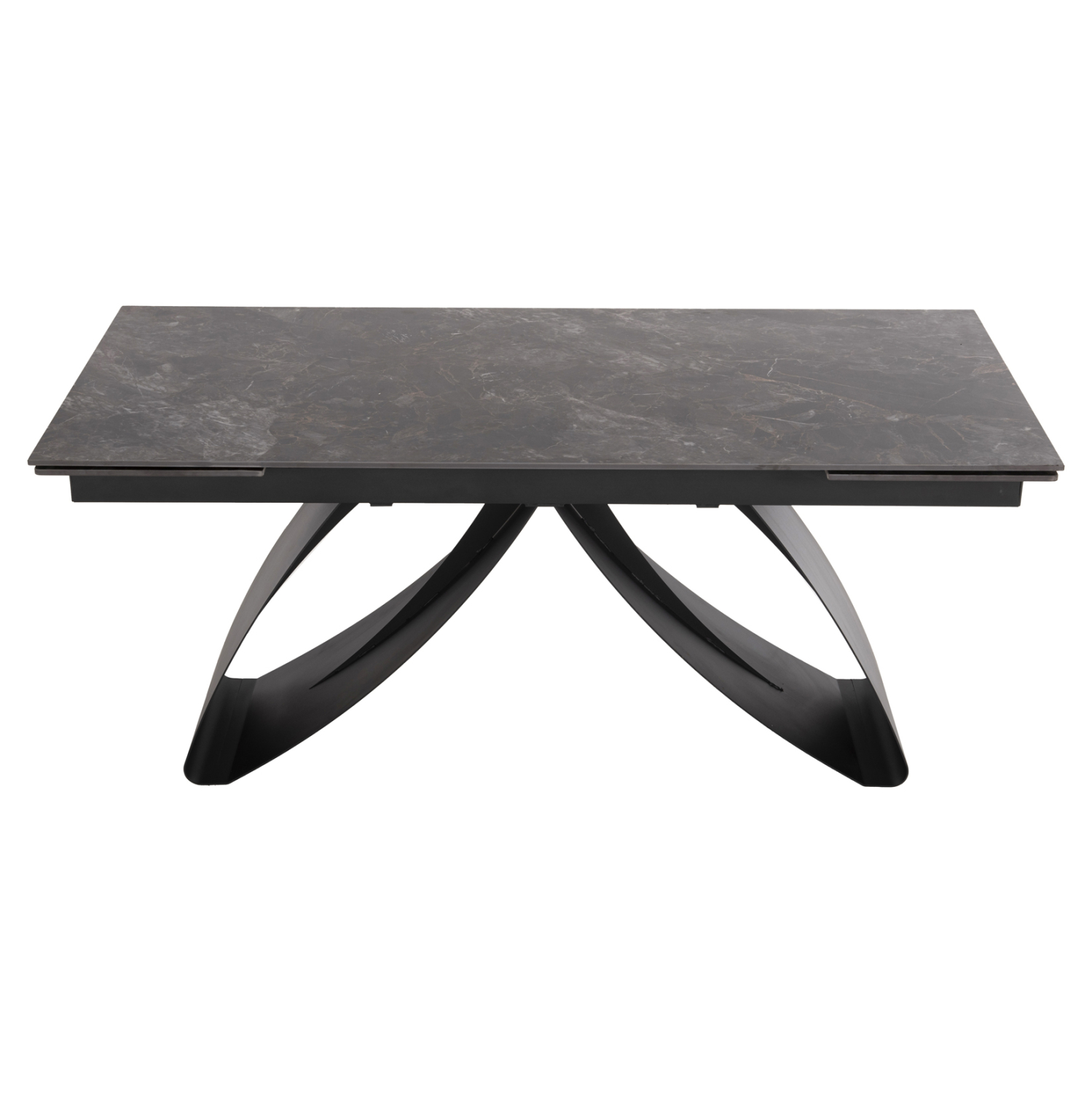 Το TEGATT είναι η επιτομή του σύγχρονου design για την τραπεζαρία! Πρόκειται για ένα τραπέζι σε ορθογώνιο σχήμα με γυαλιστερή κεραμική επιφάνεια σε χρωματισμό ΜΑΥΡΟΥ ΜΑΡΜΑΡΟΥ, που είναι και πτυσσόμενη. Διαθέτει δύο επιπλέον κομμάτια, τα οποία και «αναπτύσσονται» στις δύο πλευρές του τραπεζιού με στιβαρούς και εύχρηστους μεταλλικούς μηχανισμούς. Αυτή η επιφάνεια στηρίζεται σε δύο μεταλλικά πόδια/βάσεις με πανέμορφο design σε ΜΑΥΡΟ χρώμα. Το συγκεκριμένο τραπέζι θα αποτελέσει σημείο αναφοράς σε οποιοδήποτε χώρο τραπεζαρίας ή εστίασης κι αν τοποθετηθεί και θα αναδείξει ακόμα περισσότερο τον χώρο αλλά και τις καρέκλες ή πολυθρόνες με τις οποίες θα το συνδυάσετε.