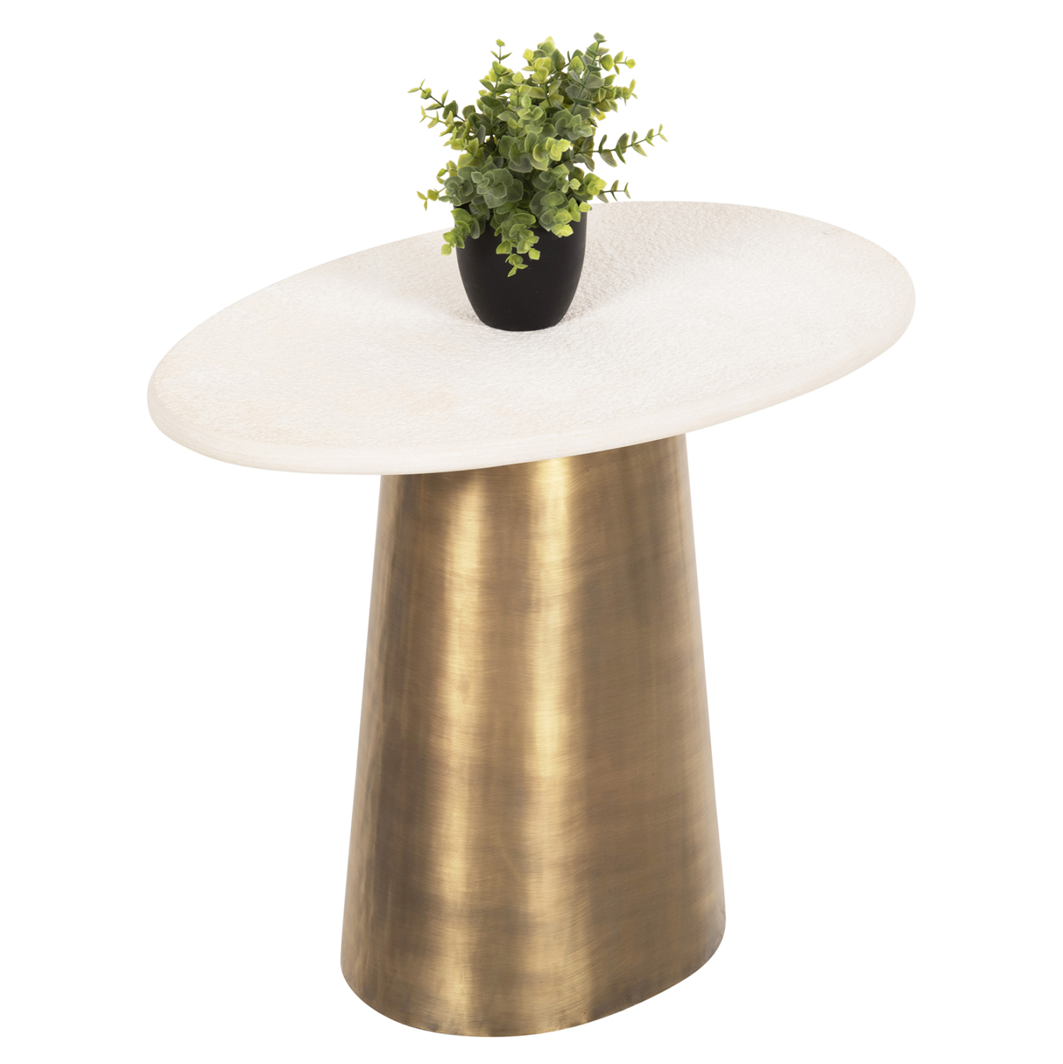 Το βοηθητικό τραπέζι FODEN για το σαλόνι είναι σε σχήμα ακανόνιστου οβάλ με μεταλλική οβάλ βάση σε ΧΡΥΣΟ χρώμα. Επάνω σε αυτή την βάση είναι μονταρισμένη η σαγρέ μαρμάρινη επιφάνεια σε ΛΕΥΚΟ χρώμα, που δίνει στο τραπέζι την αίσθηση της πολυτέλειας και της στιβαρότητας. Ιδανικό τόσο για το σπίτι, όσο και για επαγγελματικούς χώρους.