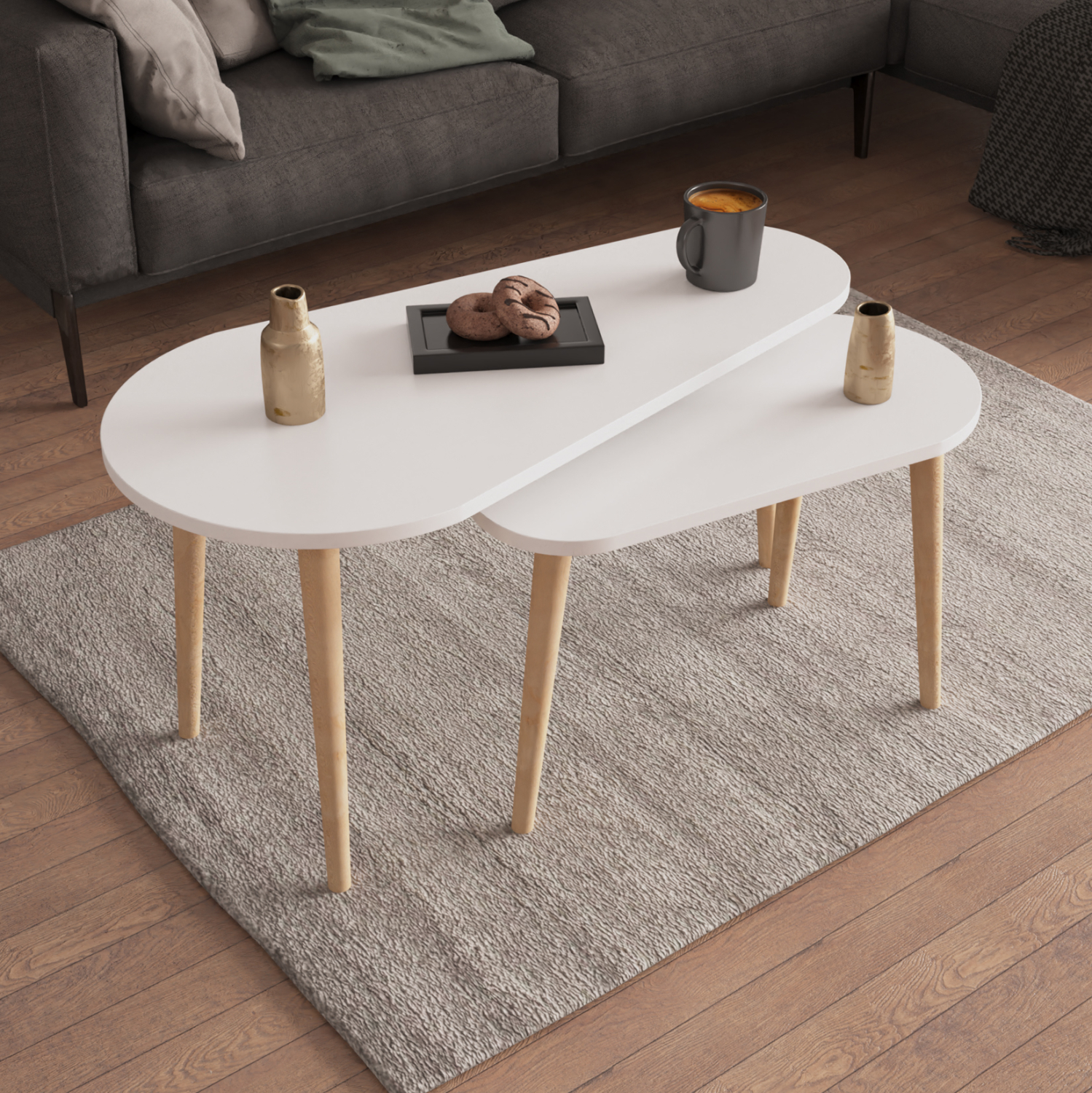 Το καινούργιο σετ 2τμχ οβάλ τραπεζιών για το σαλόνι APRILIA θα ικανοποιήσει και θα εξυπηρετήσει κάθε σας ανάγκη στο χώρο του σαλονιού. Πρόκειται για 2 τρίποδα τραπέζια με επιφάνειες από μελαμίνη 18mm σε ΛΕΥΚΟ χρώμα και τα δύο, ενώ τα πόδια είναι ξύλινα σε ΦΥΣΙΚΟ χρώμα ξύλου.