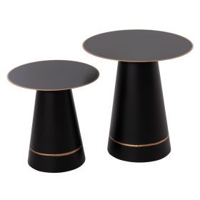 Το σετ 2 τραπεζιών BALLI για το σαλόνι είναι μια από τις νέες προσθήκες στην γκάμα μας. Πρόκειται για 2 μεταλλικά τραπεζάκια στρογγυλά με κωνική βάση και flat επιφάνειες σε ΜΑΥΡΟ ματ χρώμα. Οι χρυσές λεπτομέρειες τόσο στις επιφάνειες, όσο και στις βάσεις δίνουν μια όμορφη όψη στα τραπέζια. Ιδανικά τόσο για το σπίτι, όσο και για επαγγελματικούς χώρους.
