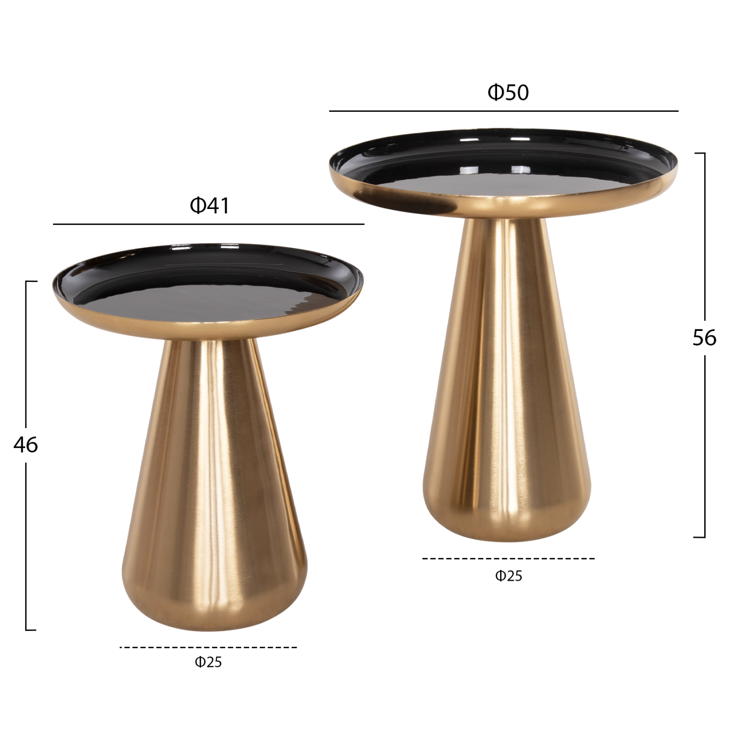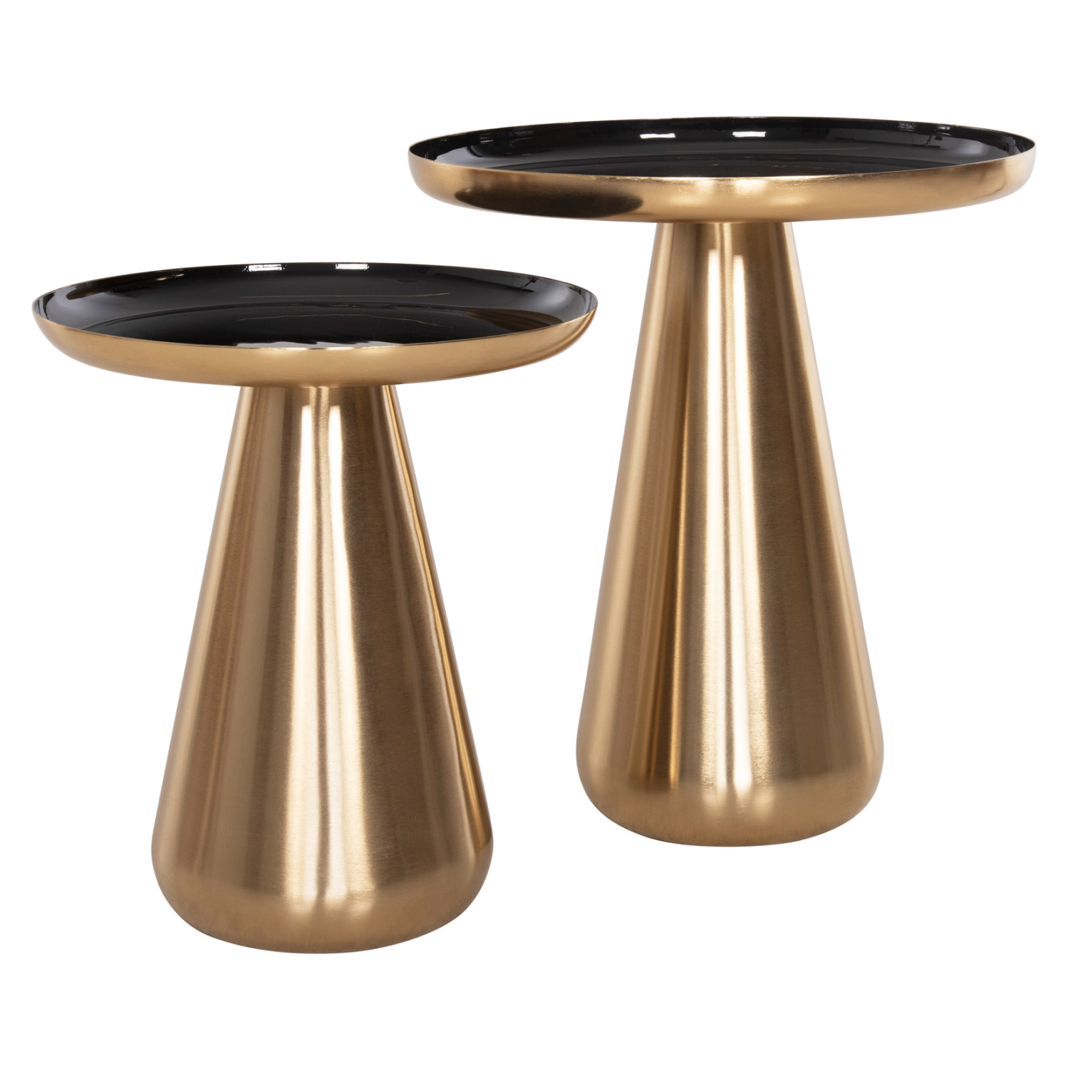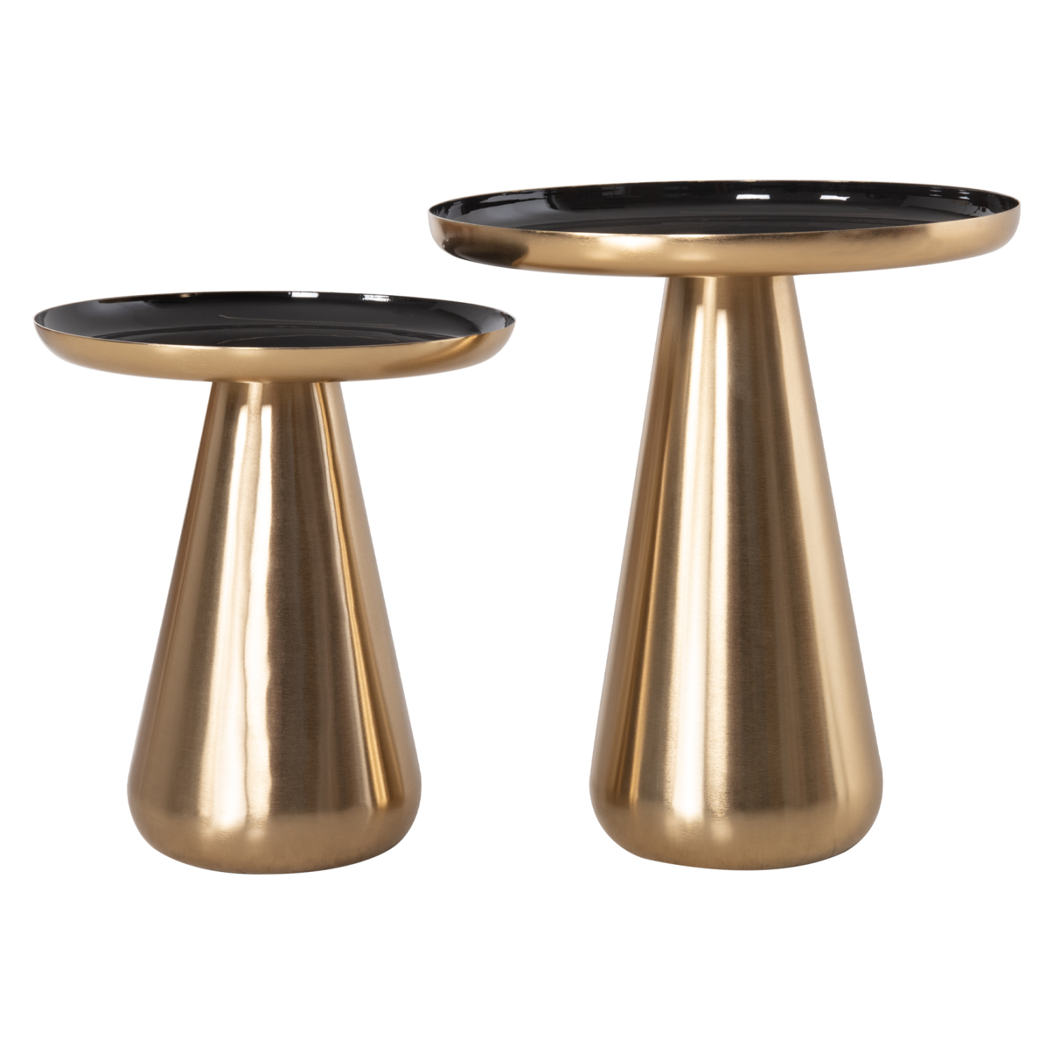 Το σετ 2 τραπεζιών OLUF για το σαλόνι είναι μια από τις νέες προσθήκες στην γκάμα μας. Πρόκειται για 2 μεταλλικά τραπεζάκια στρογγυλά με κωνική βάση σε ΧΡΥΣΟ γυαλιστερό χρώμα. Οι επιφάνειες είναι glossy ΜΑΥΡΕΣ και έχουν χρυσή περίμετρο. Ιδανικά τόσο για το σπίτι, όσο και για επαγγελματικούς χώρους.