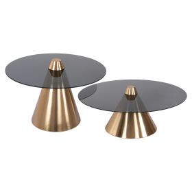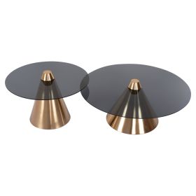Το σετ 2 τραπεζιών REBEN για το σαλόνι είναι μια από τις νέες προσθήκες στην γκάμα μας. Πρόκειται για 2 μεταλλικά τραπέζια στρογγυλά με κωνική βάση. Το χρώμα τους είναι ΧΡΥΣΟ brushed. Οι επιφάνειες είναι ΜΑΥΡΕΣ φιμέ γυάλινες. Ιδανικά τόσο για το σπίτι, όσο και για επαγγελματικούς χώρους.
