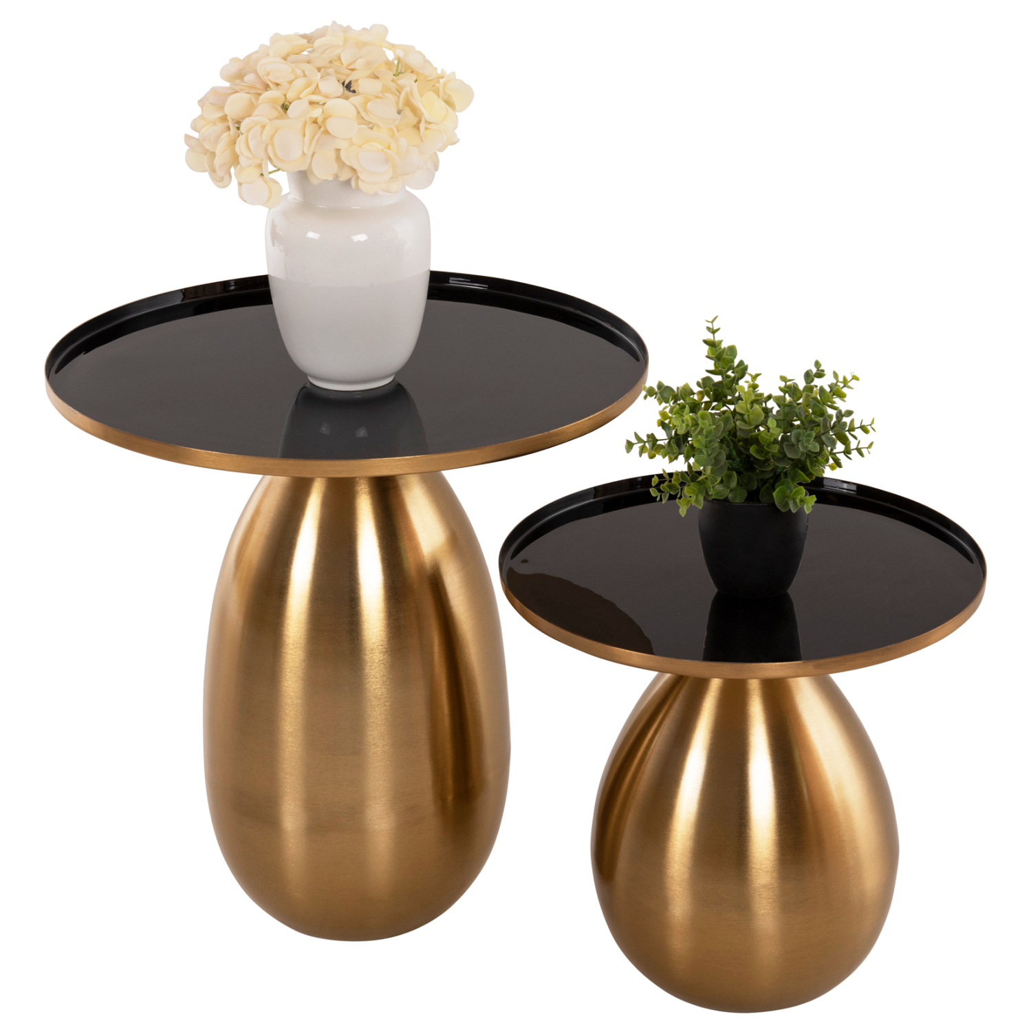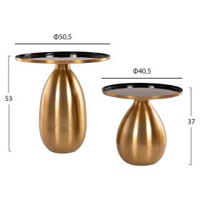 Το σετ 2 τραπεζιών DEANNA για το σαλόνι είναι μια από τις νέες προσθήκες στην γκάμα μας. Πρόκειται για 2 τραπεζάκια στρογγυλά με κυλινδρική βάση και μεταλλικά. Το χρώμα τους είναι χρυσό ενώ η επιφάνειά είναι μαύρη. Η ιδιαιτερότητα αυτών των τραπεζιών είναι οι γυαλιστερές επιφάνειες που προσδίδουν μια αίσθηση καθαρότητας και πολυτέλειας στο σαλόνι σας. Ιδανικά τόσο για το σπίτι, όσο και για επαγγελματικούς χώρους.