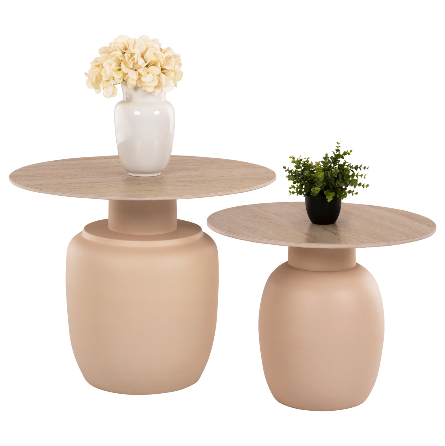 Το σετ 2 τραπεζιών FEREN για το σαλόνι είναι μια από τις νέες προσθήκες στην γκάμα μας. Πρόκειται για 2 τραπεζάκια στρογγυλά με κυλινδρική βάση και μεταλλικά. Το χρώμα τους είναι ΚΡΕΜ. Οι επιφάνειες είναι κεραμικές, σε παρόμοια απόχρωση με τις βάσεις. Η κρεμ απόχρωση προσδίδει μια αίσθηση αγνότητας και κομψότητας στον χώρο. Ιδανικά τόσο για το σπίτι, όσο και για επαγγελματικούς χώρους.