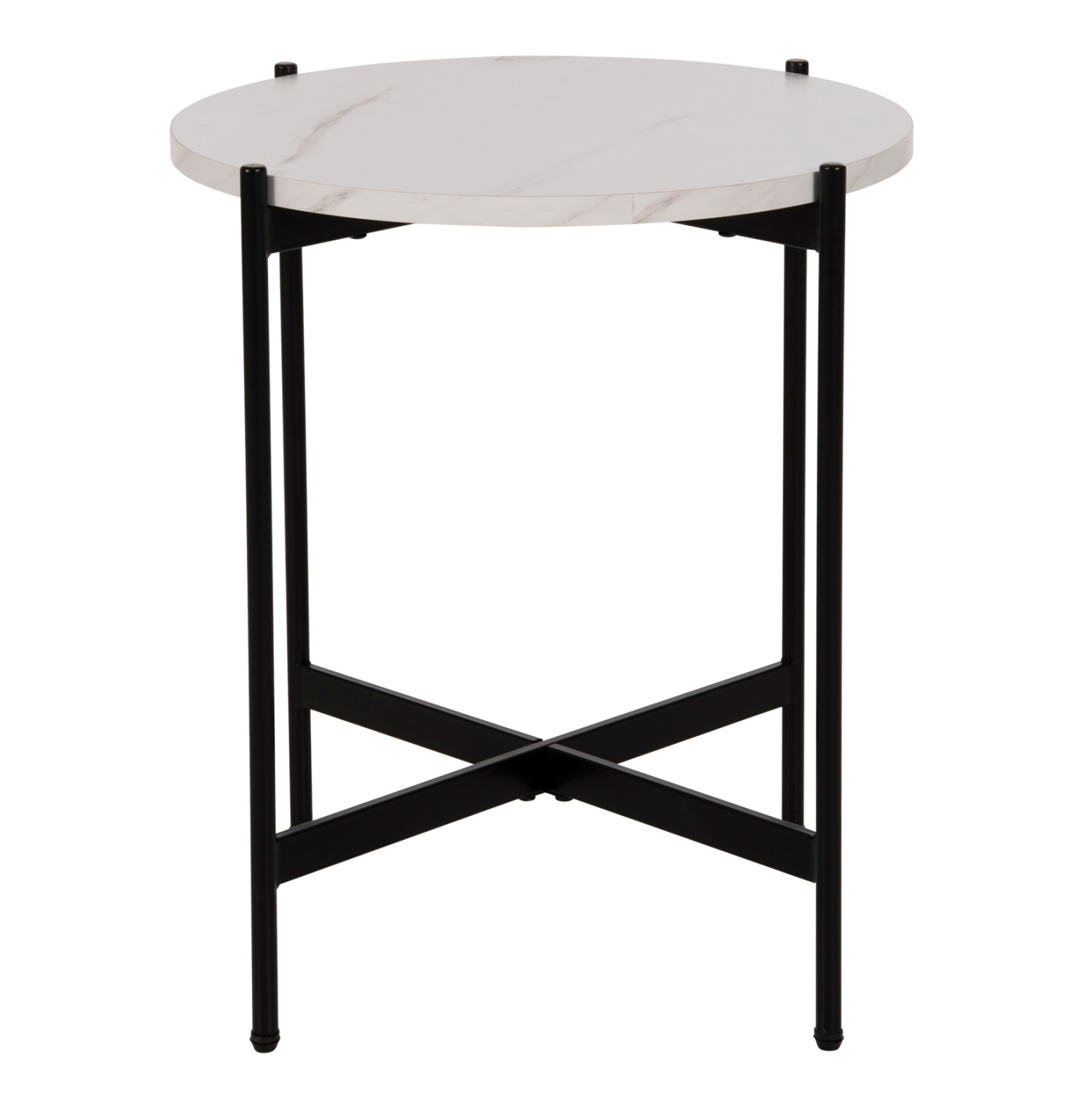 Το βοηθητικό τραπεζάκι ΗΜ9589.05 θα σας ενθουσιάσει με το στυλ και την πρακτικότητά του. Πρόκειται για ένα στρογγυλό ψηλό σχετικά τραπεζάκι με ιδιαίτερο χαρακτηριστικό ότι η επιφάνεια στηρίζεται σε μια βάση με χιαστί διάταξη. Η βάση είναι μεταλλική σε ΜΑΥΡΟ χρώμα, ενώ η επιφάνεια είναι κατασκευασμένη από MDF σε χρώμα ΛΕΥΚΟ ΜΑΡΜΑΡΟ.