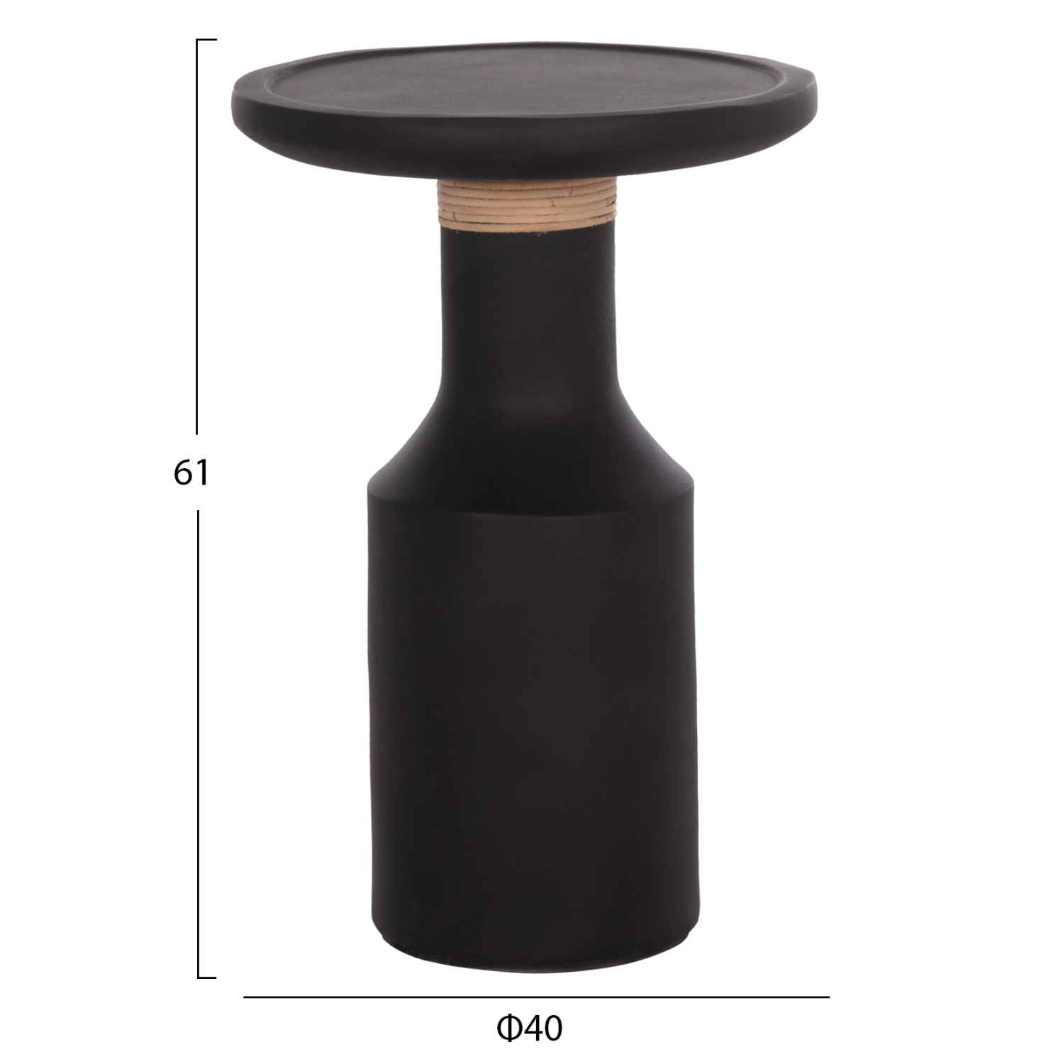 Το βοηθητικό τραπέζι σαλονιού TRED(Τ) είναι ψηλό και στρογγυλό με minimal διακόσμηση/επένδυση στον μακρύ «λαιμό» από φυσικό Rattan. Είναι κατασκευασμένο εξολοκλήρου από Fiber Cement σε ΜΑΥΡΟ χρώμα και αποτελεί ιδανικό συμπλήρωμα τόσο για το σπίτι, όσο και για επαγγελματικούς χώρους, όπως ξενοδοχεία, AirBnB, κτλ.