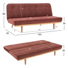 Καναπές τριθέσιος με βελούδινη επένδυση σε χρώμα σάπιο μήλο. Γίνεται κρεβάτι με μηχανισμό που «ρίχνει» την πλάτη.