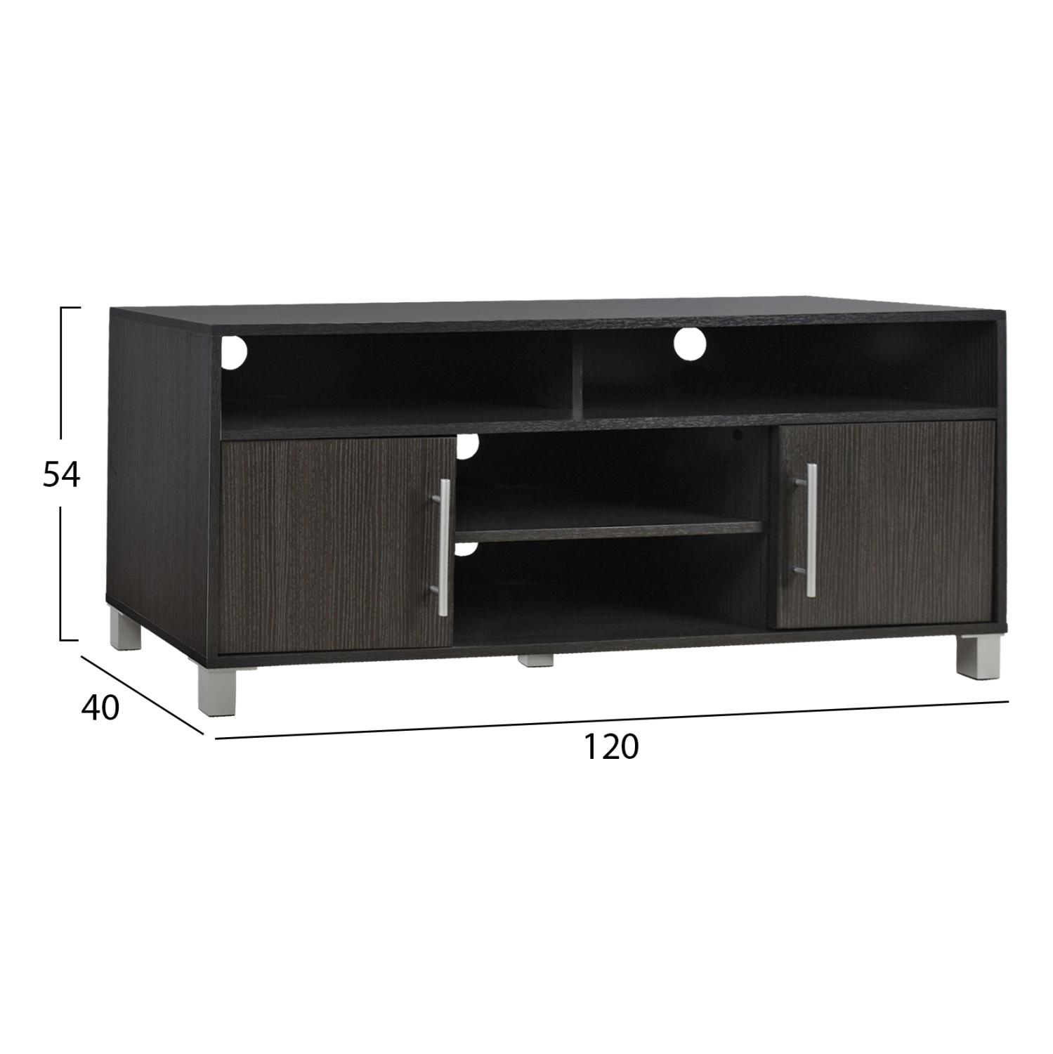 Κλασικό έπιπλο τηλεόρασης με ντουλαπάκια και ράφια, από μελαμίνη σε χρώμα ZEBRANO.