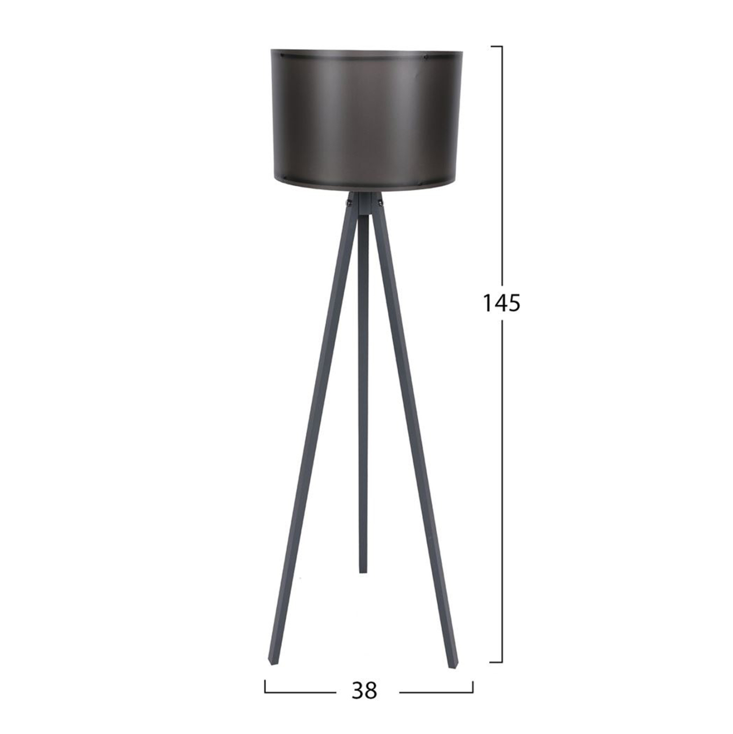 Τρίποδο φωτιστικό δαπέδου με γκρι πόδια και μαύρο καπέλο.