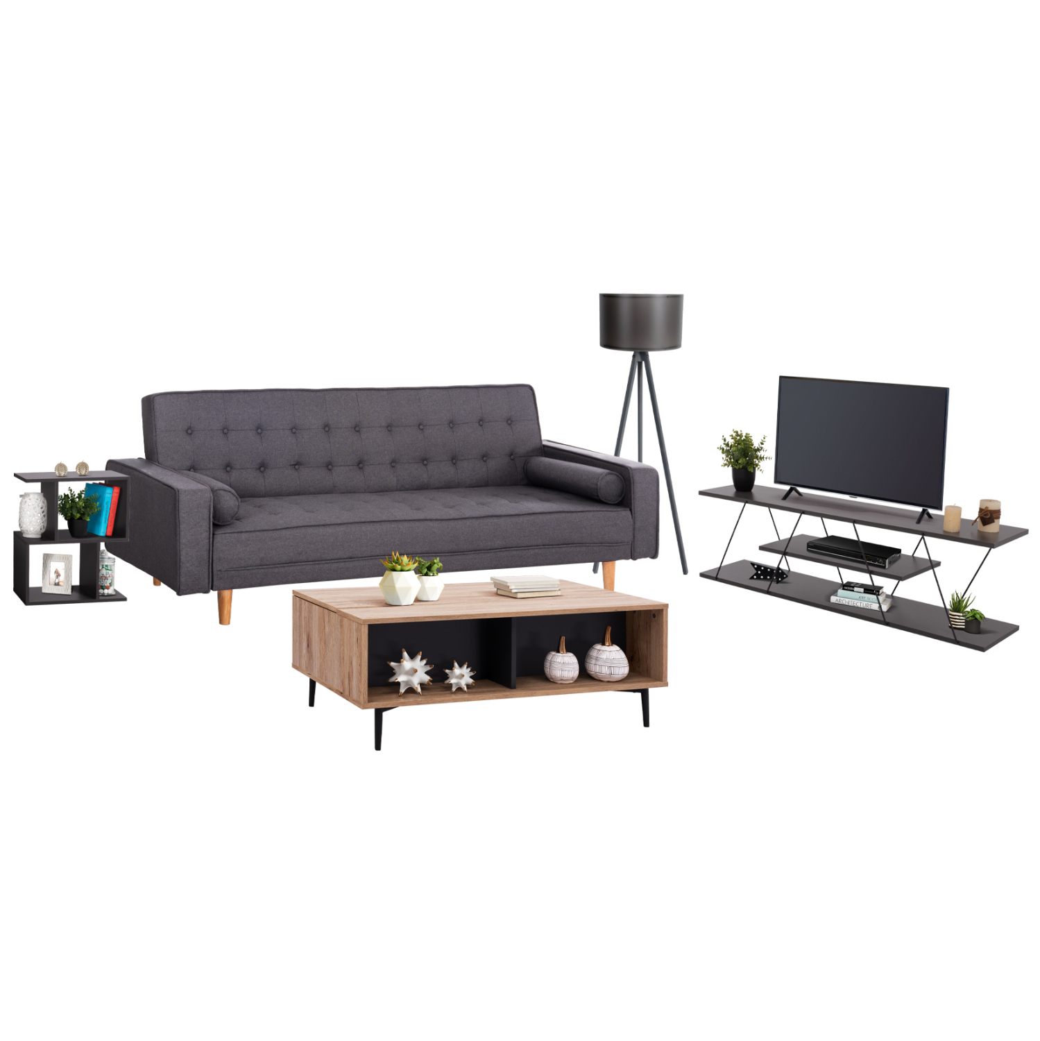 Αυτό το σετ περιλαμβάνει καναπέ-κρεβάτι, τραπέζι σαλονιού, βοηθητικό τραπέζι, έπιπλο τηλεόρασης, και φωτιστικό δαπέδου!