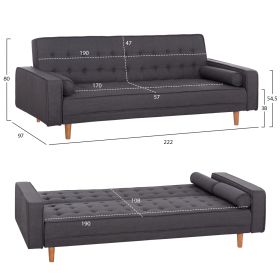 3θέσιος καναπές με μπράτσα και με γκρι ύφασμα που γίνεται κρεβάτι όταν «πέφτει» η πλάτη.