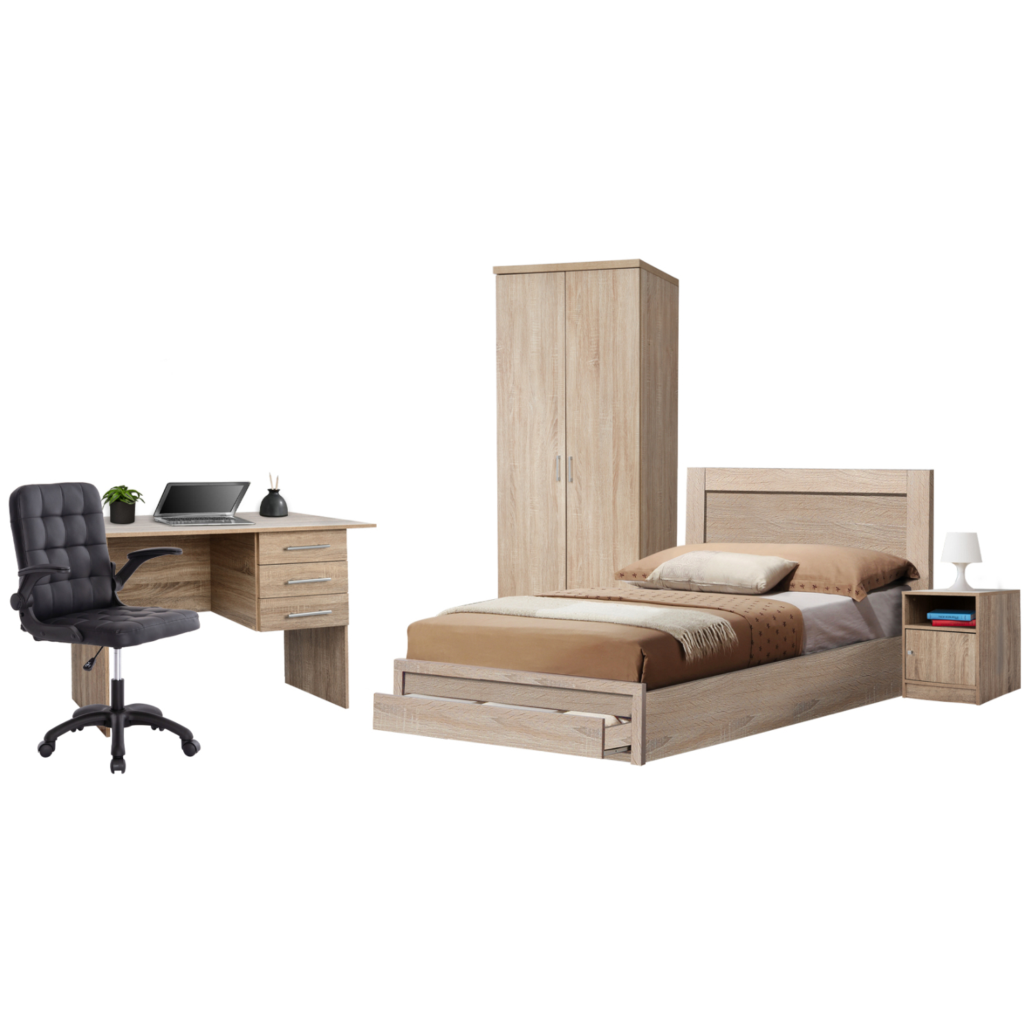 Αυτό το σετ περιλαμβάνει ένα κομοδίνο, ένα κρεβάτι, μια ντουλάπα, μια καρέκλα γραφείου, και ένα γραφείο! Αναλυτικά: