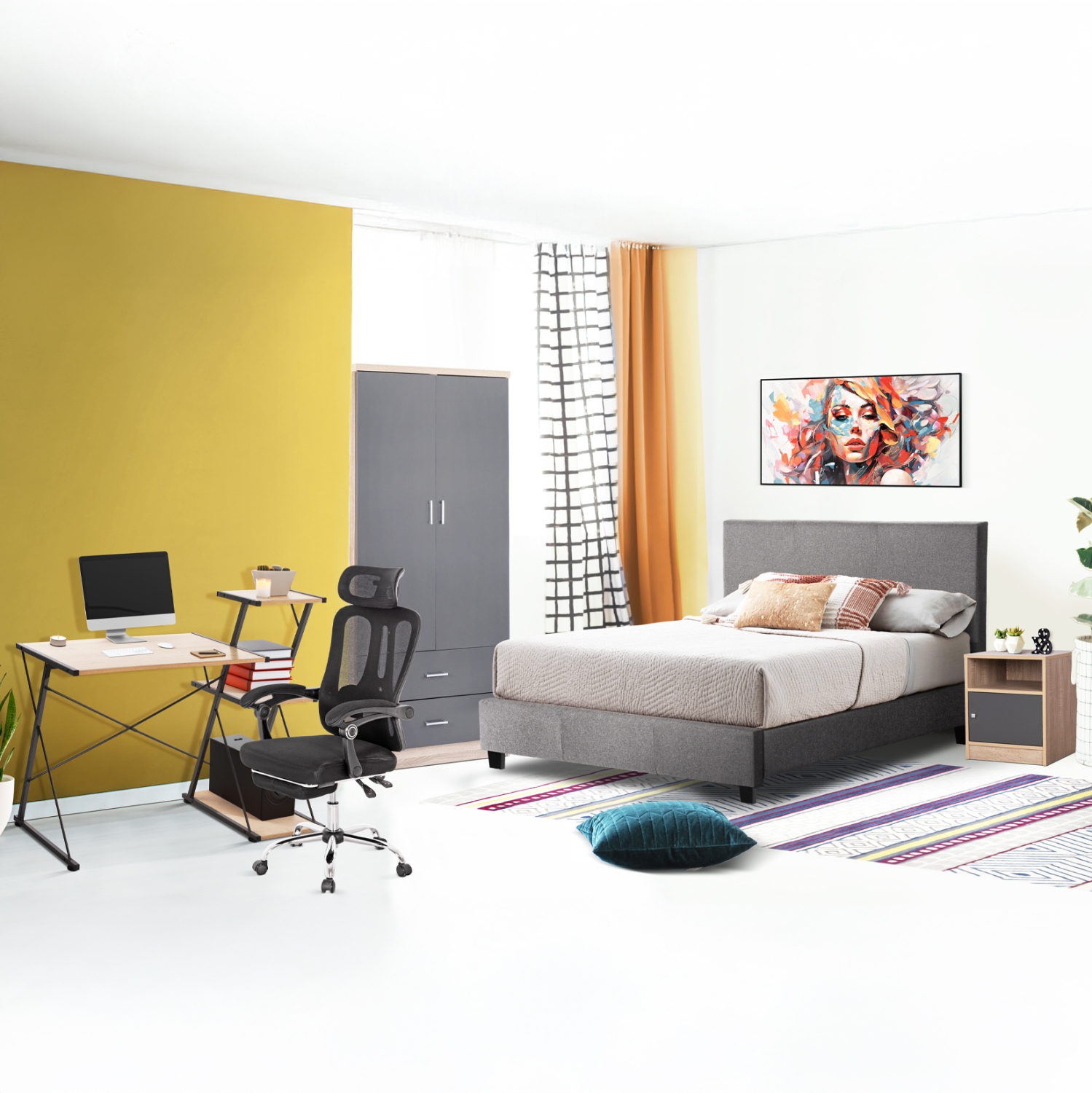 Αυτό το σετ περιλαμβάνει κρεβάτι, στρώμα, κομοδίνο, γραφείο, καρέκλα γραφείου, και 2φυλλη ντουλάπα!