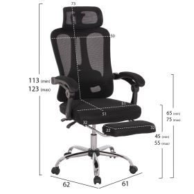 Καρέκλα γραφείου με ύφασμα mesh σε μαύρο χρώμα με ανεξάρτητο ρυθμιζόμενο προσκέφαλο και πτυσσόμενο υποπόδιο κάτω από το κάθισμα.
