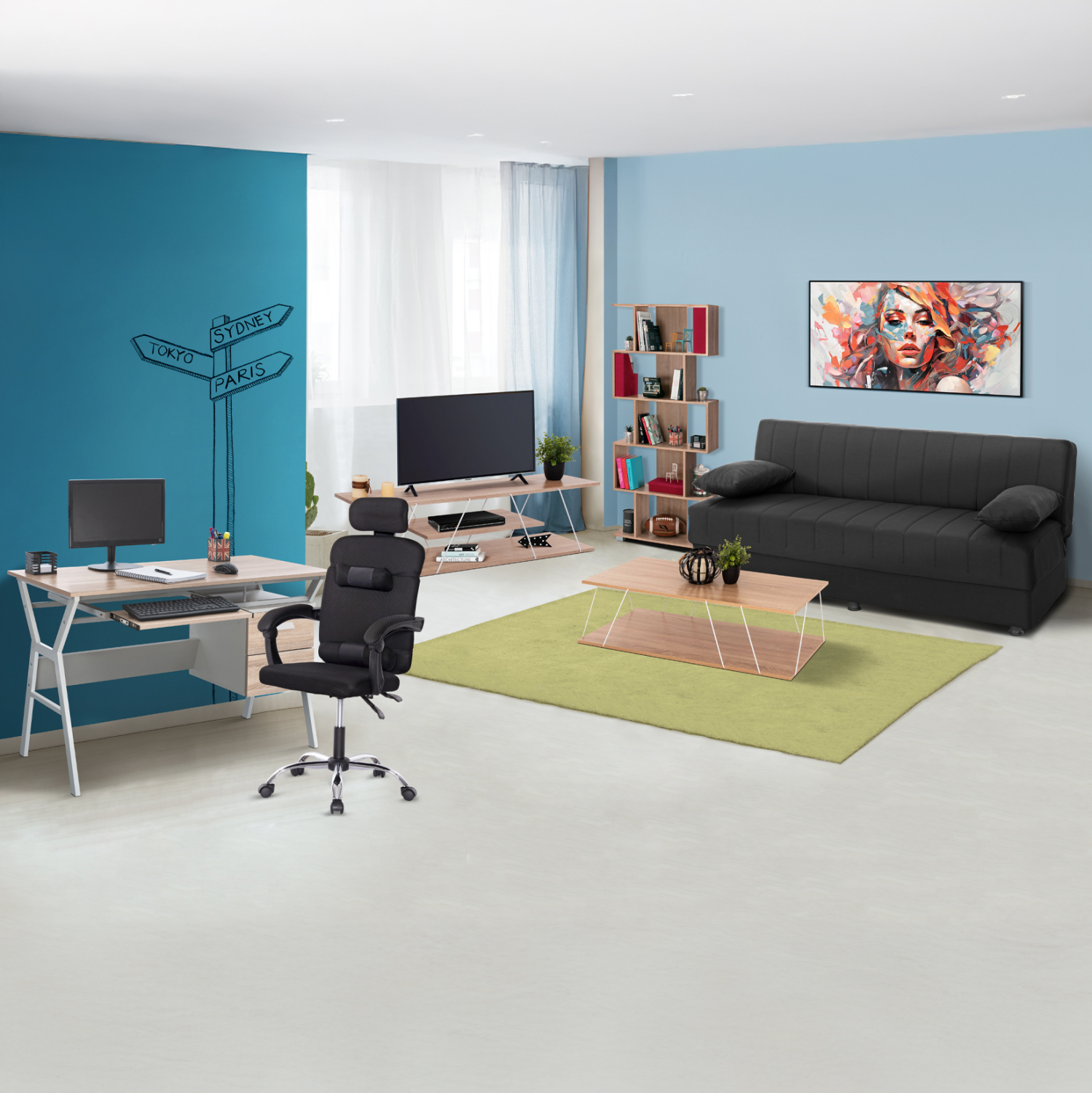Αυτό το σετ περιλαμβάνει καναπέ-κρεβάτι, βιβλιοθήκη, τραπέζι σαλονιού, γραφείο, καρέκλα γραφείου, και έπιπλο τηλεόρασης!