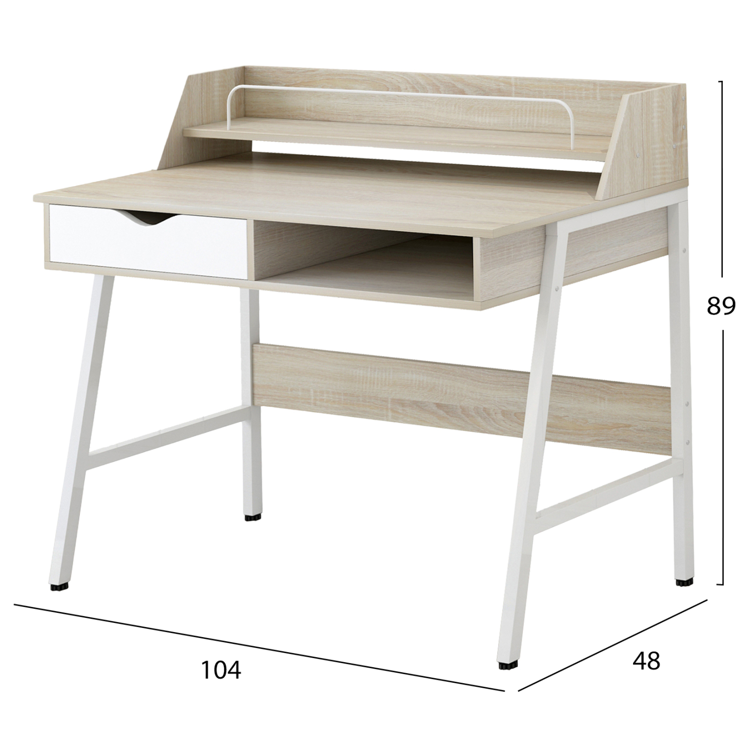 Γραφείο με λευκό μεταλλικό σκελετό και επιφάνειες μελαμίνης σε sonama χρώμα. Διαστάσεις: 104x48x89Υ εκ.