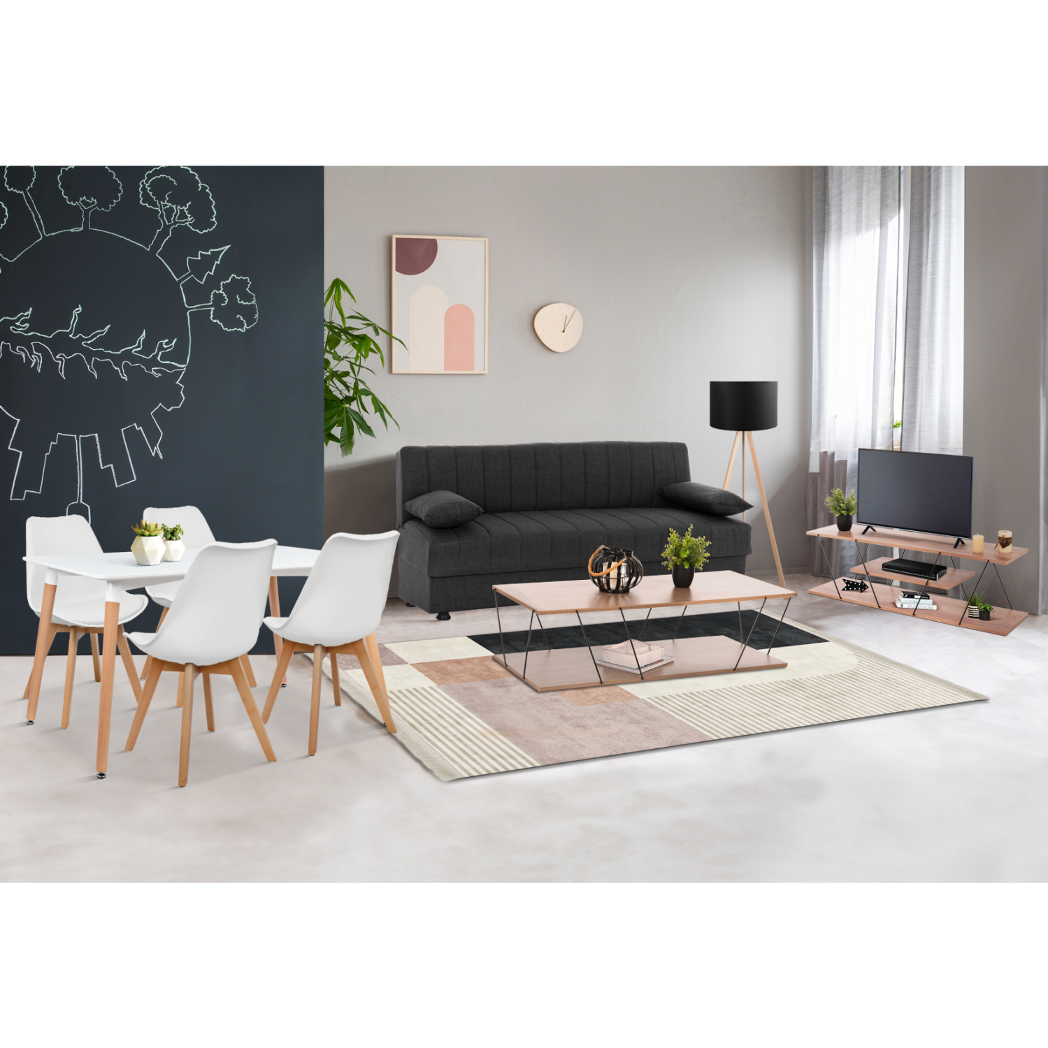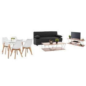 Αυτό το σετ περιλαμβάνει καναπέ-κρεβάτι με αποθηκευτικό χώρο, τραπέζι σαλονιού, έπιπλο TV, τραπέζι κουζίνας, και 4 καρέκλες τραπεζαρίας.