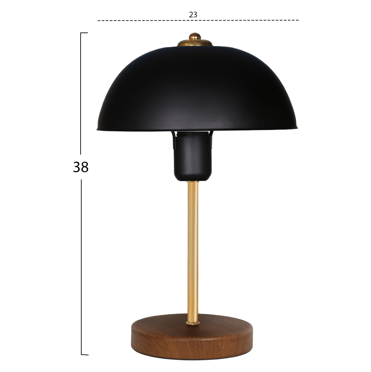 Επιτραπέζιο διακοσμητικό φωτιστικό με ξύλινη κυκλική βάση σε καφέ χρώμα και «καπέλο» σε σχήμα μανιτάρι σε μαύρο χρώμα. Το φως διαχέεται στον χώρο κυρίως προς τα κάτω και η αντανάκλασή του πάνω στην χρυσή μεταλλική κολωνίτσα του φωτιστικού παιχνιδίζει ευχάριστα στο μάτι. Αυτού του είδους τα φωτιστικά δεν προορίζονται για φωτιστικά διαβάσματος και αυτό πρέπει πάντα να λαμβάνεται υπόψη κατά την επιλογή τους. Είναι καθαρά διακοσμητικά και το ταίριασμά τους με τον περιβάλλοντα χώρο θα πρέπει να είναι αρμονικό. Αυτό το φωτιστικό είναι λιτό, κομψό και βολικό σε διαστάσεις παρέχοντας αμέτρητες δυνατότητες «δεσίματος» με την υπόλοιπη διακόσμησή σας. Είναι ένα μικρό έργο τέχνης.