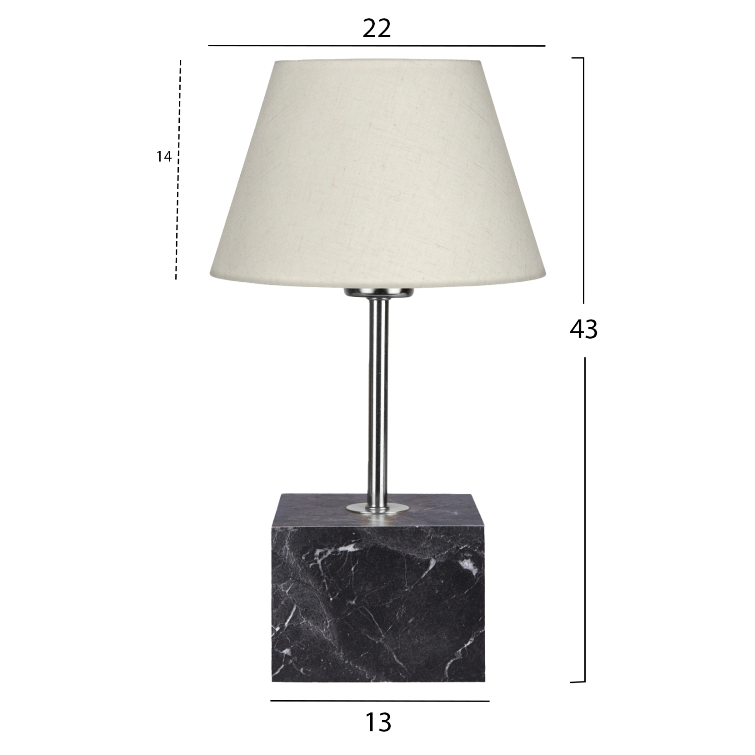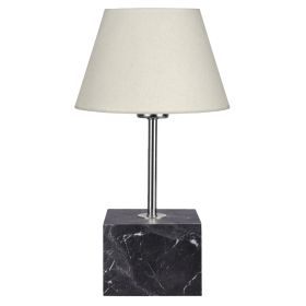Επιτραπέζιο διακοσμητικό φωτιστικό με μονή κολώνα. Η βάση του φωτιστικού έχει το σχήμα κύβου με όψη ανθρακί μαρμάρου ενώ η κολώνα είναι σε ασημί χρώμα. Το «καπέλο» έχει τραπεζοειδές κυκλικό σχήμα σε χρώμα εκρού. Το φως διαχέεται στον χώρο ευχάριστα και η αντανάκλασή του πάνω στην χρυσή κολωνίτσα του φωτιστικού αλλά και στην κυβική βάση, παιχνιδίζει ευχάριστα στο μάτι. Αυτού του είδους τα φωτιστικά δεν προορίζονται για φωτιστικά διαβάσματος και αυτό πρέπει πάντα να λαμβάνεται υπόψη κατά την επιλογή τους. Είναι καθαρά διακοσμητικά και το ταίριασμά τους με τον περιβάλλοντα χώρο θα πρέπει να είναι αρμονικό. Αυτό το φωτιστικό είναι κομψό και βολικό σε διαστάσεις παρέχοντας αμέτρητες δυνατότητες «δεσίματος» με την υπόλοιπη διακόσμησή σας. Είναι ένα μικρό έργο τέχνης.